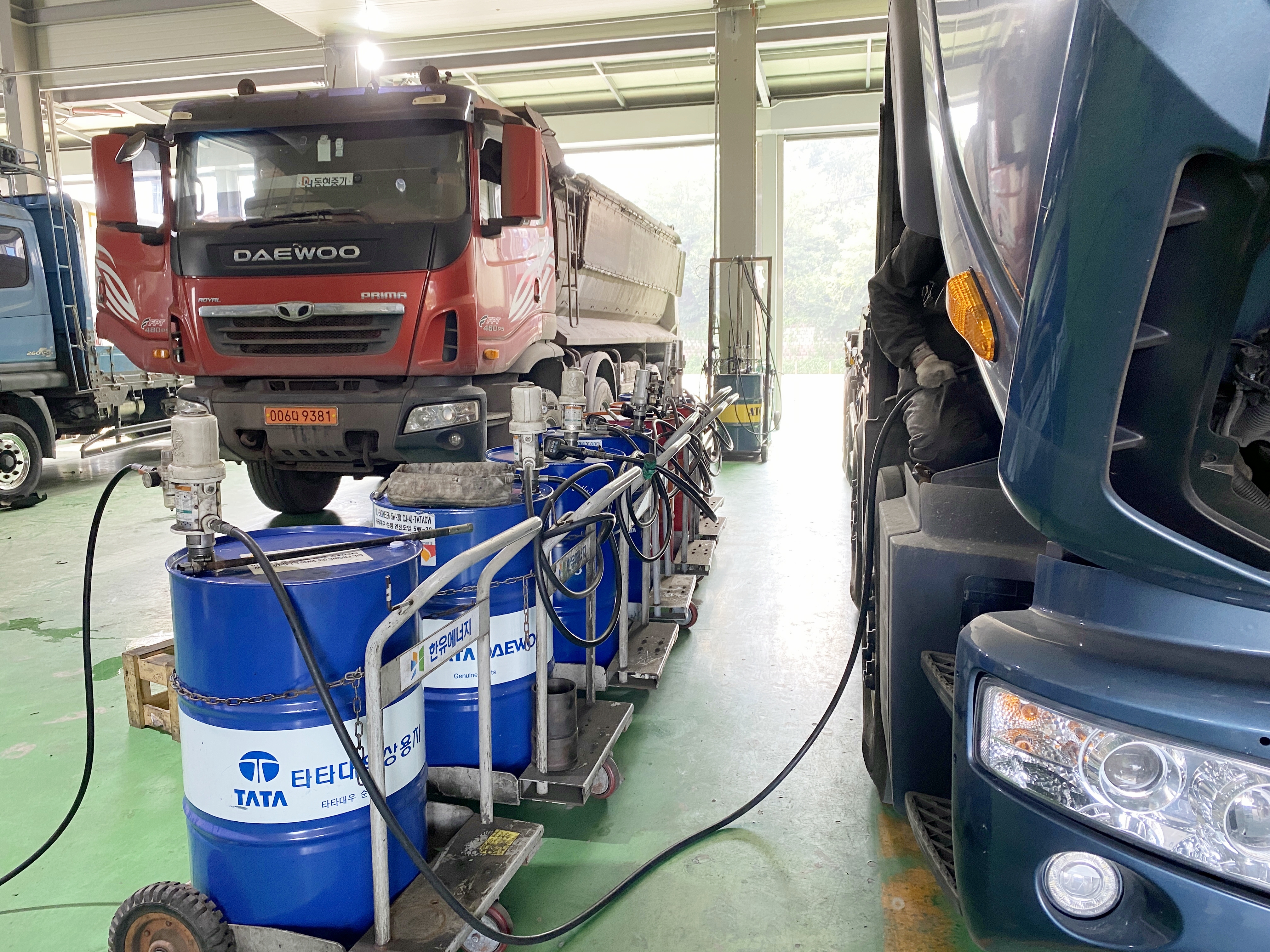 딸깍 딸깍 소리와 함께 엔진오일이 주입됩니다. 단순 오일값만 하더라도 어지간한 국산 승용차에 최고급 엔진오일로 교체하는 총비용보다 더 비쌀 겁니다. 수입 승용차랑 비교하면 그 차들이 센터에서 교체하는 비용이 더 비쌀겁니다.