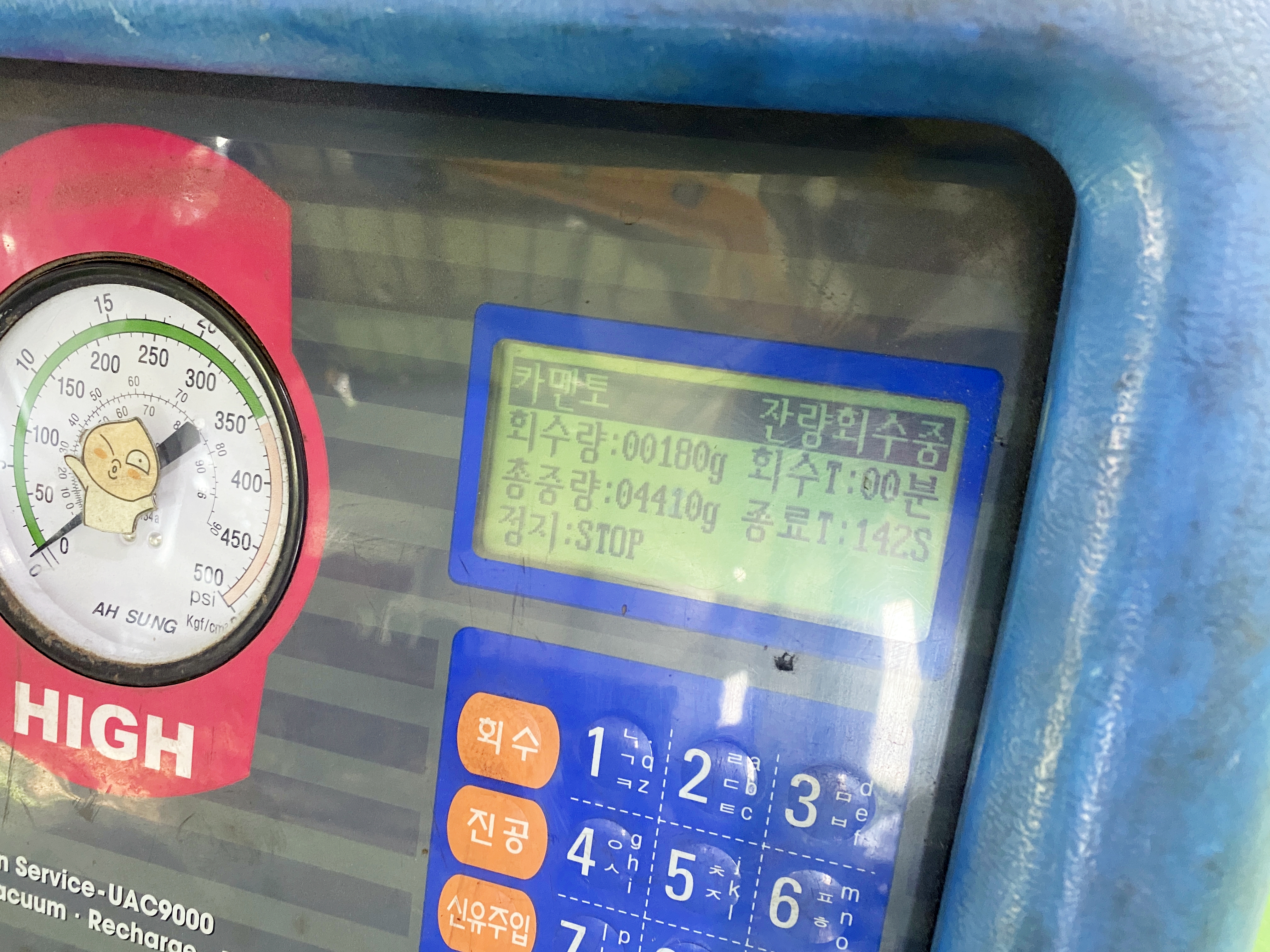 사진이 촬영된 시점에 회수된 냉매의 양은 180g. 종료시간까지 약 200g 남짓 회수되고 말았습니다. 냉매의 정량이 600g 수준이지만, 약 3분의 1은 빠져 도망갔다는 이야기겠죠. 가스의 회수가 끝나면 본격적인 콤프레샤 교체작업에 들어갑니다.