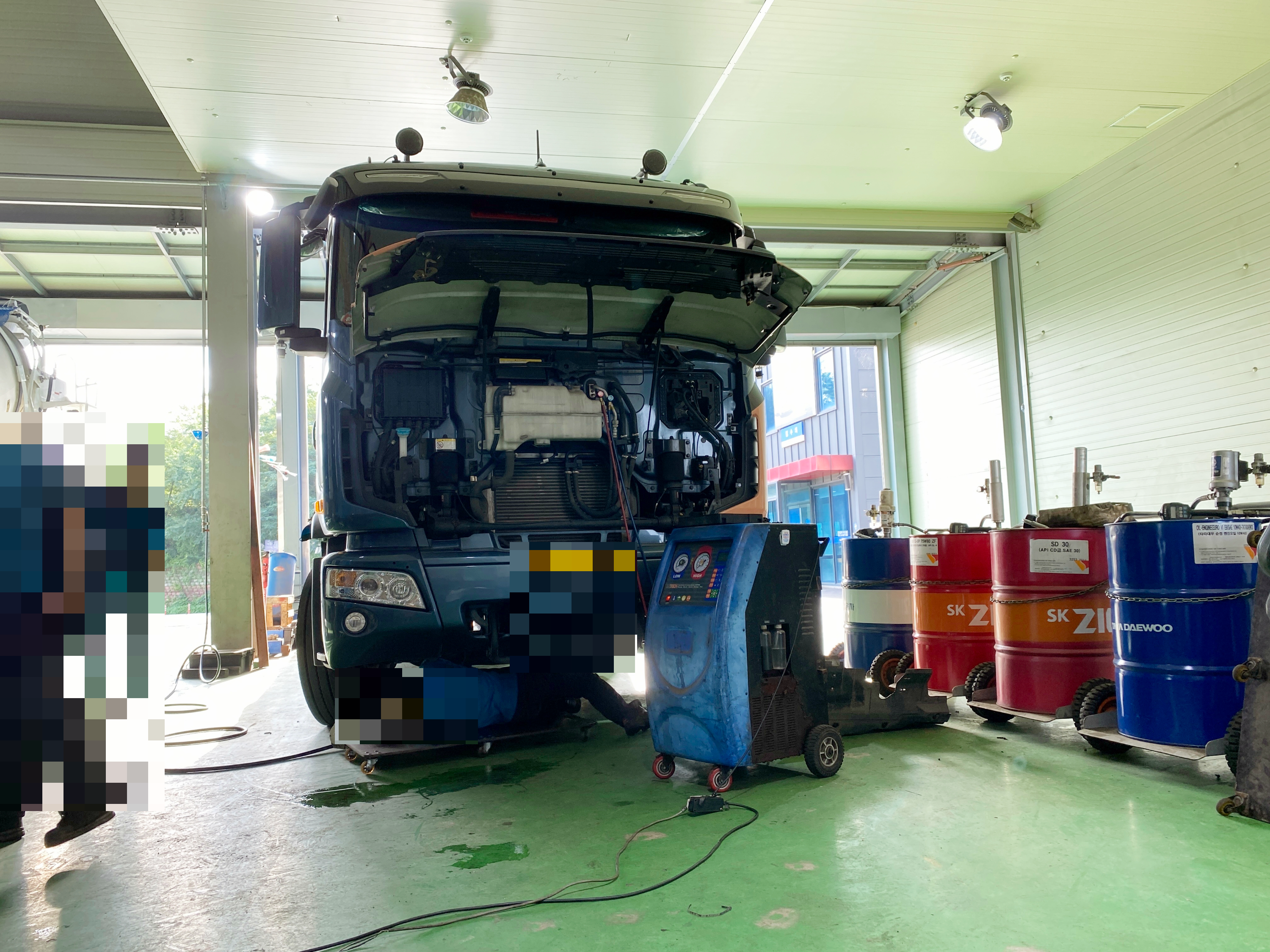 딸깍 딸깍 소리와 함께 엔진오일이 주입됩니다. 단순 오일값만 하더라도 어지간한 국산 승용차에 최고급 엔진오일로 교체하는 총비용보다 더 비쌀 겁니다. 수입 승용차랑 비교하면 그 차들이 센터에서 교체하는 비용이 더 비쌀겁니다.