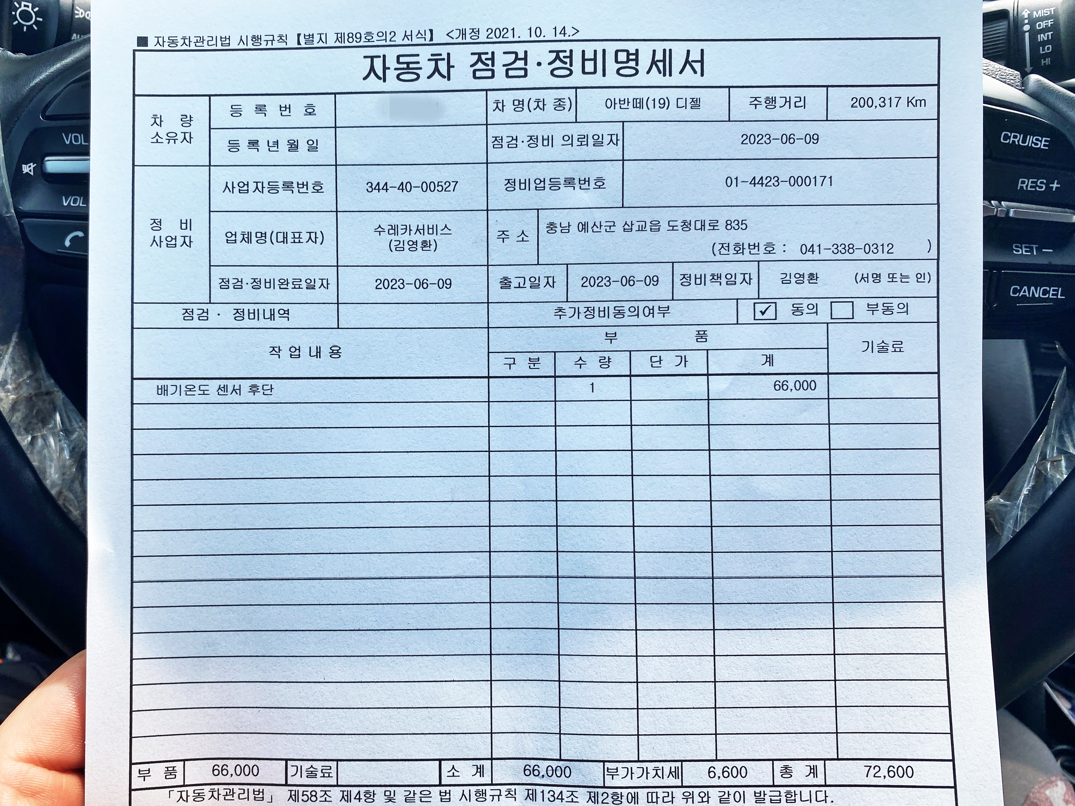 센서와 공임 부가세까지 72,000원을 결제하고 왔습니다.