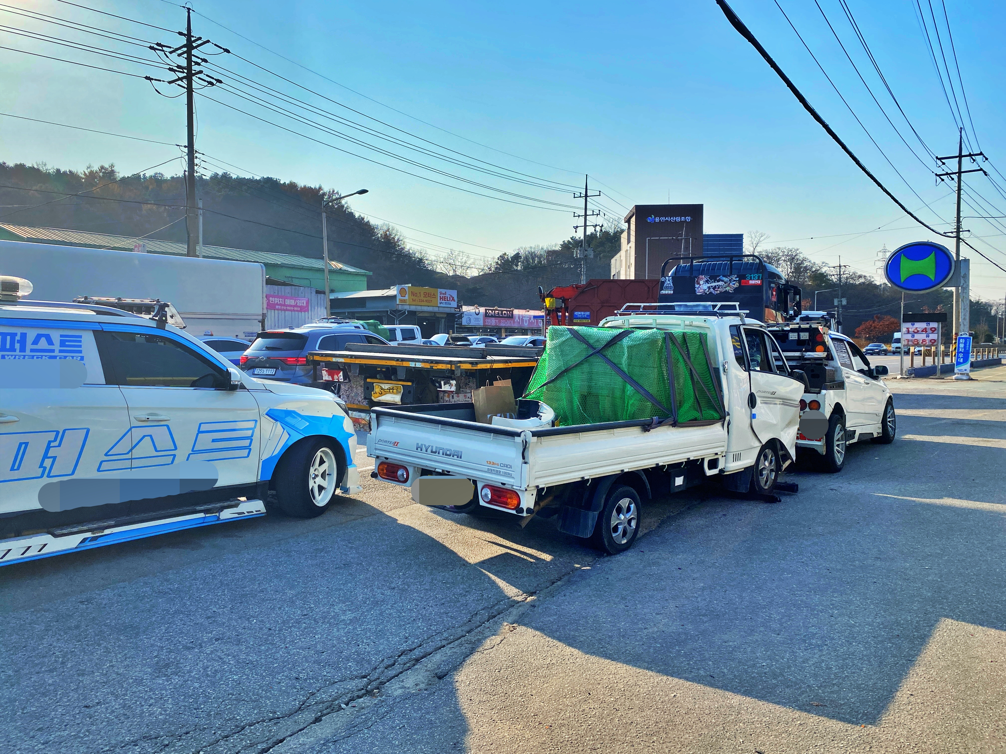 일단 자력으로 이동이 가능한 저는 직접 차를 몰고, 포터는 견인차에 실려 교통 흐름에 방해되지 않도록 갓길로 치웁니다. 충돌 당시 생긴 파편들을 렉카기사가 정리하고, 경찰관이 수신호를 하네요. 포터 아저씨도 경황이 없으셔서 모르겠다고 하시는데, 갑자기 눈앞에 정차된 차가 보였다고 합니다. 그나마 제 차가 크고 무거워서 앞으로 밀리지 않아 연쇄 추돌사고는 일어나지 않았습니다.