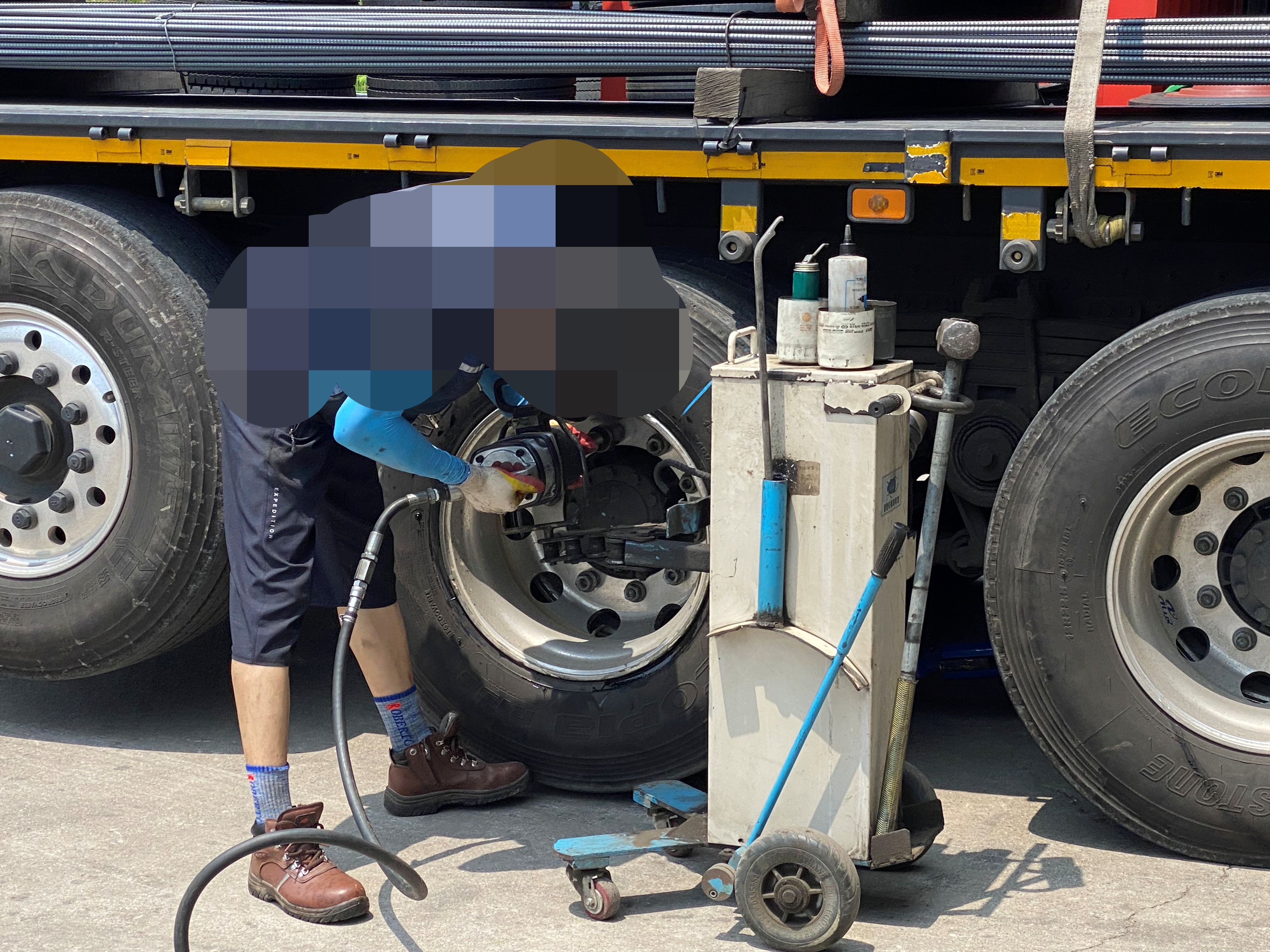 차량 사이즈가 크니 당연히 공구들도 큽니다. 그리고 소리도 크네요. 승용차처럼 지렁이를 박는 방식이 아니라 휠과 타이어를 분리하여 펑크가 난 자리를 안쪽에서 때우는 방식으로 수리가 진행됩니다.
