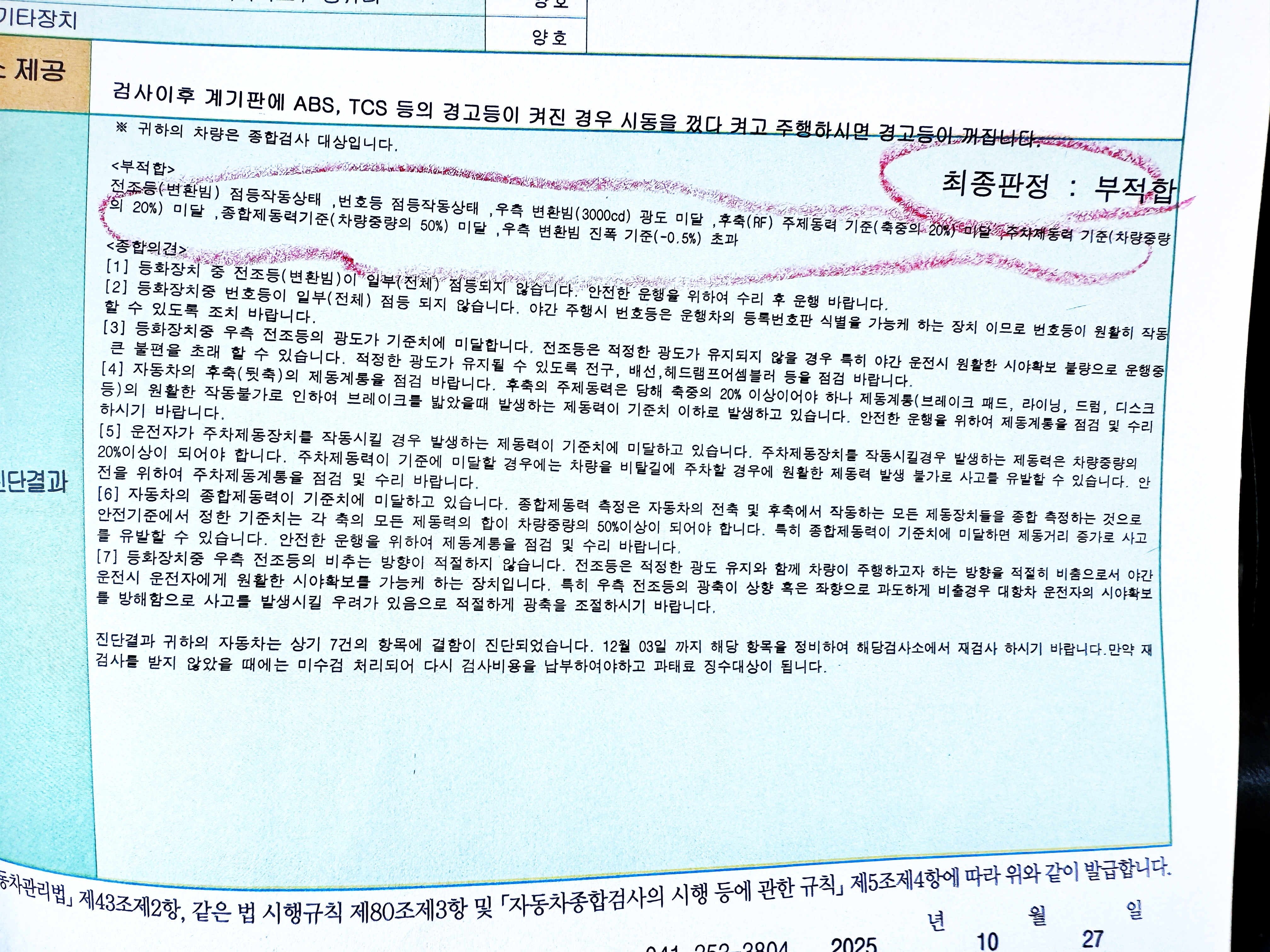 그래서 진단결과는 전조등 번호판등 그리고 제동력 미달이라고 합니다.