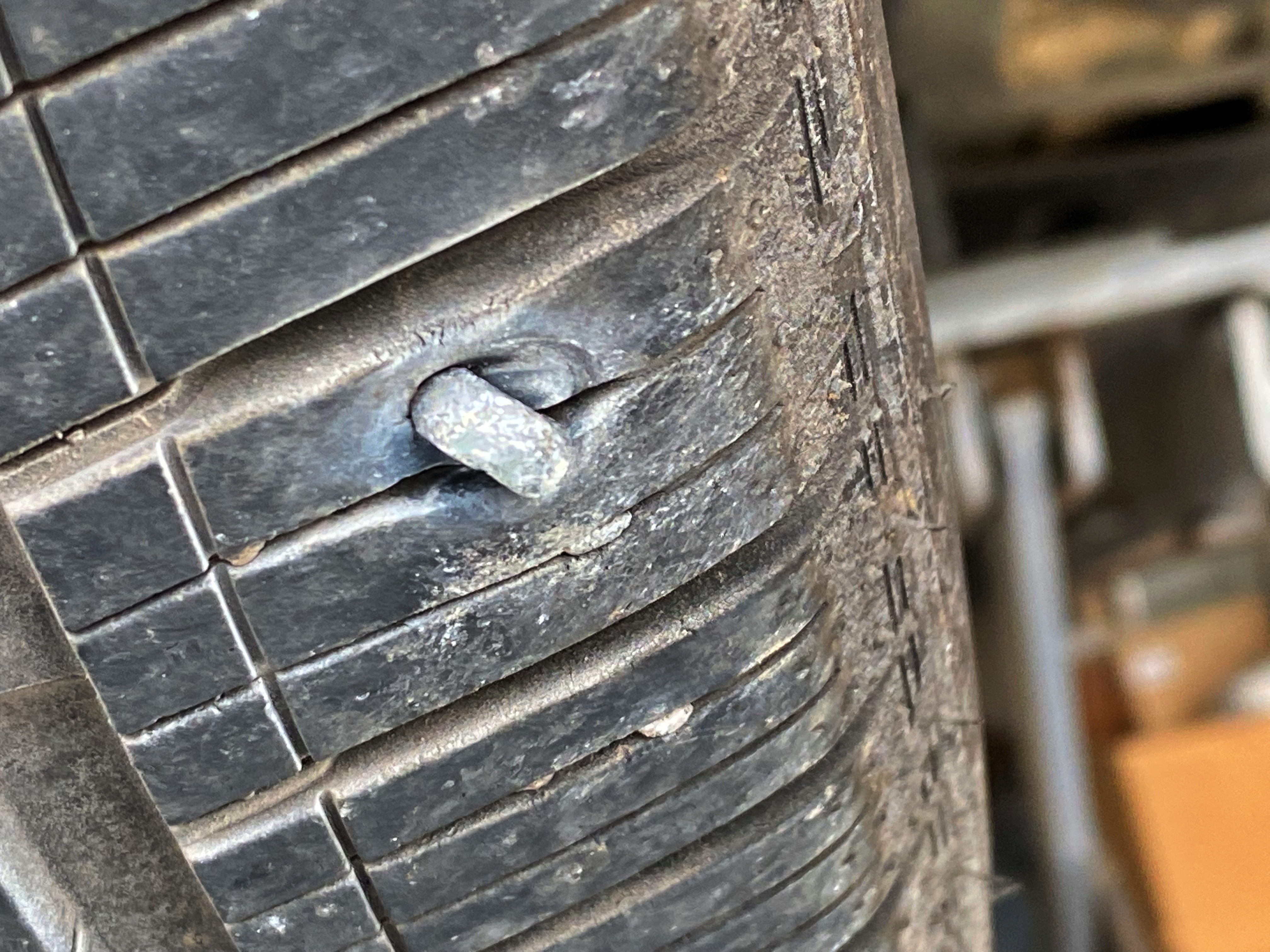 변속기는 중립에 놓고 차를 띄운 뒤 뒷바퀴를 굴려가며 이물질이 박힌 자리를 찾아냅니다. 꽤 큰 철핀같은게 박혀버렸습니다. 큼지막해서 그런건지 금방 찾아내더군요.