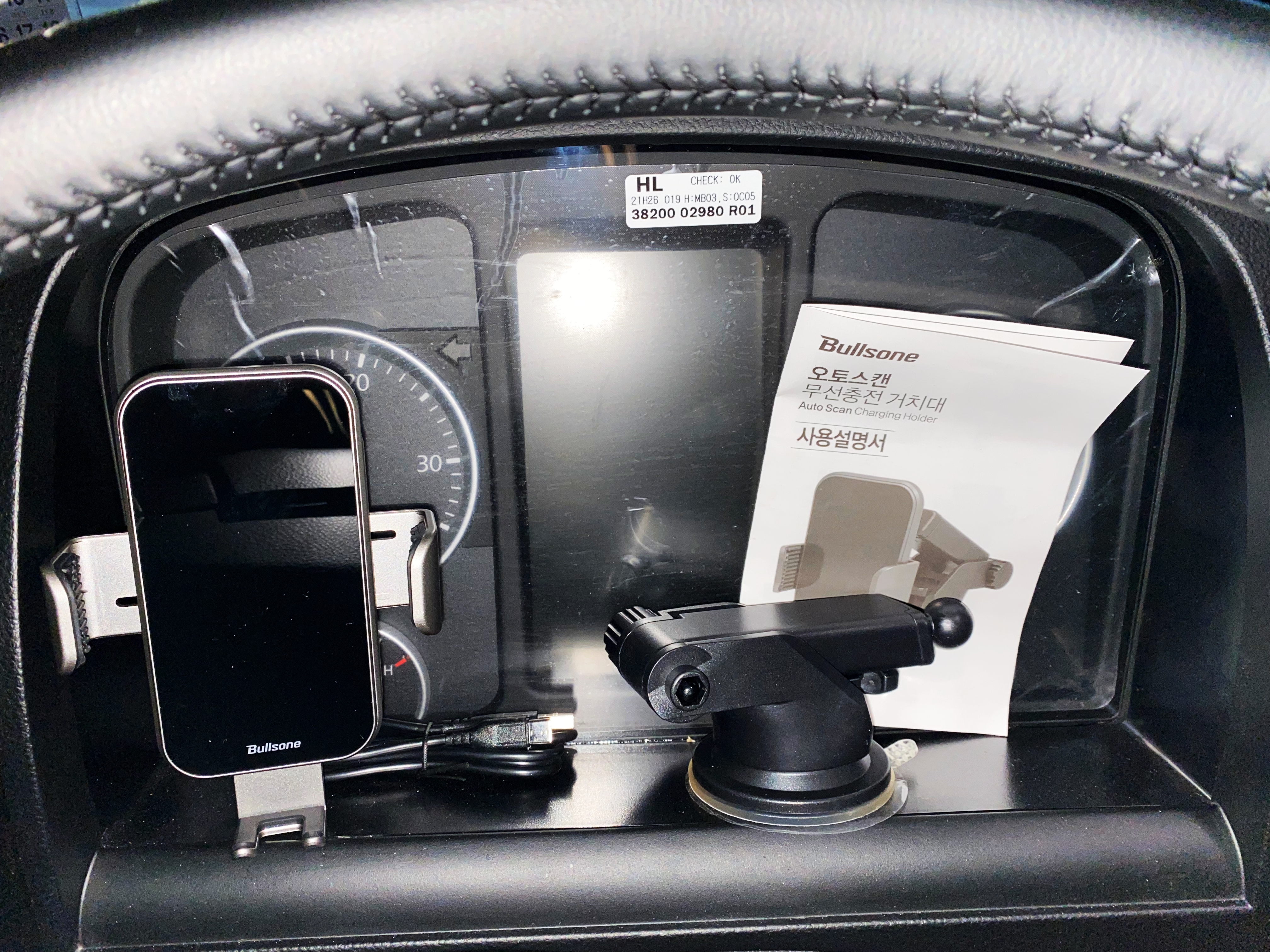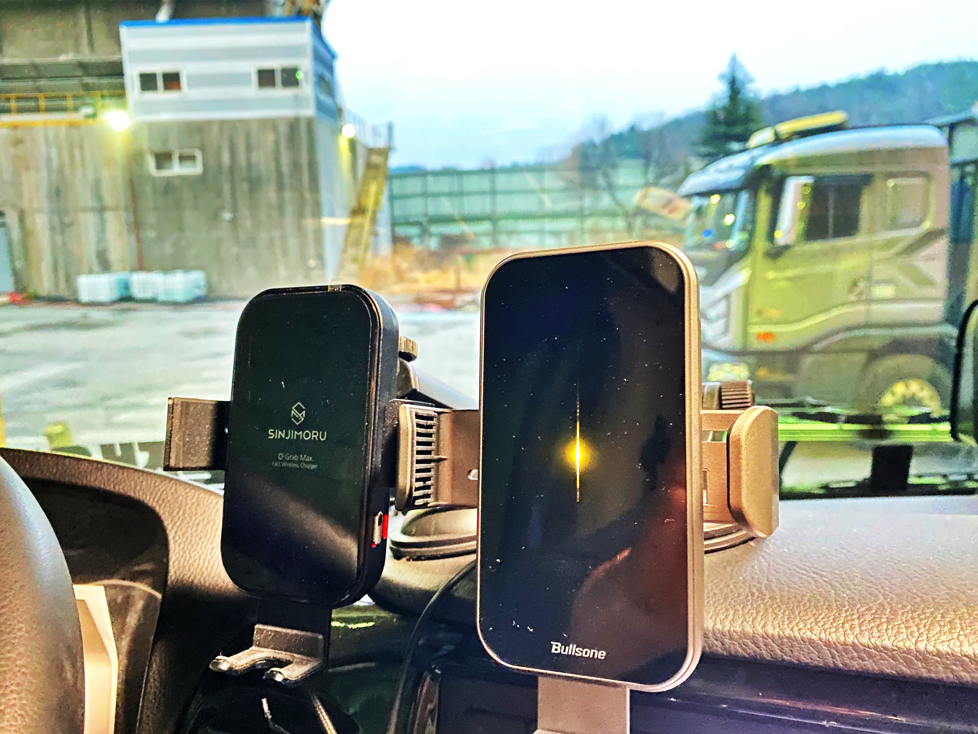 기존 무선충전기 옆에 불스원 오토스캔 무선충전거치대를 설치하여 사용합니다.
