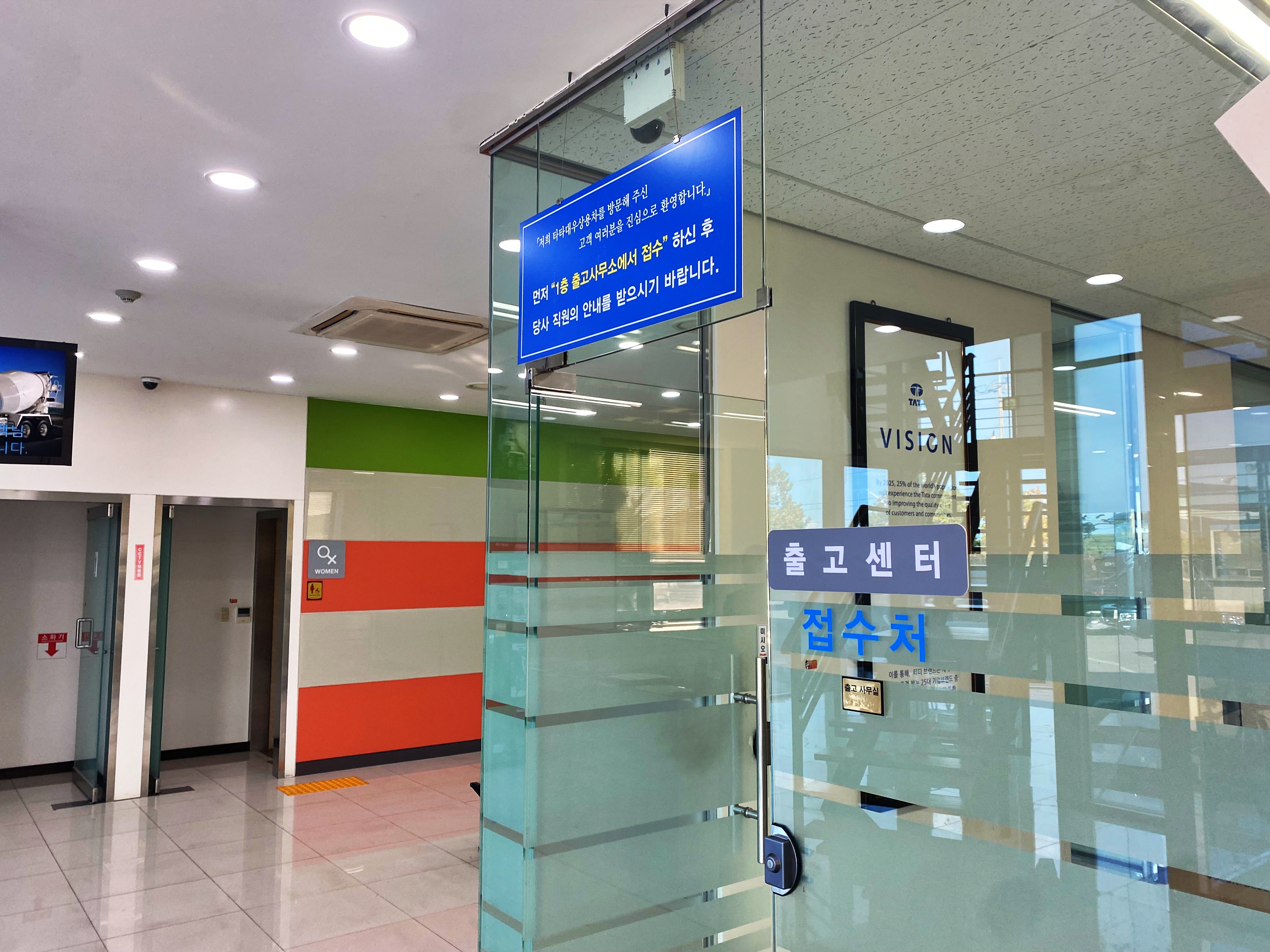 방문을 환영한다는 문구가 출고센터 사무실 앞 모니터에 표시되고 있습니다.