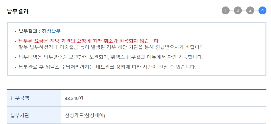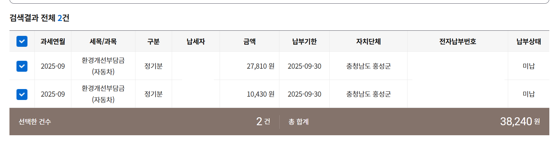 딱 납부 대상 두 건이 표시되네요. 둘 다 한꺼번에 카드로 납부했습니다.