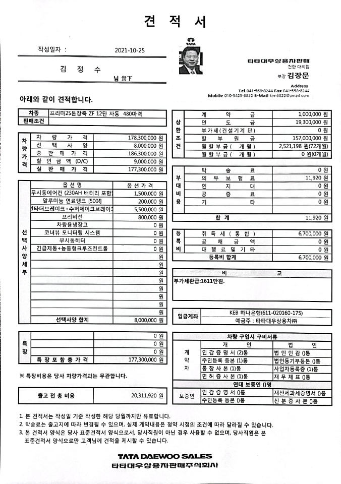 누군가가 풀옵션으로 주문했다가 취소했던 프리마 25톤 카고트럭을 영업소에서 잡아놨고, 마침 시기가 맞아 그 차를 계약했습니다. 신차도 한참 기다려 받아야 하는 시기에 운이 좋아 10월 19일에 생산되었으나 붕 떠버린 차를 매우 빠르게 받을 수 있게 된 상황이죠. 생각보다 준비해야하는 부분이 많았고, 캐피탈 승인까지 다 받은 금요일(10월 29일)에 차를 받으러 갈 수 있었습니다.