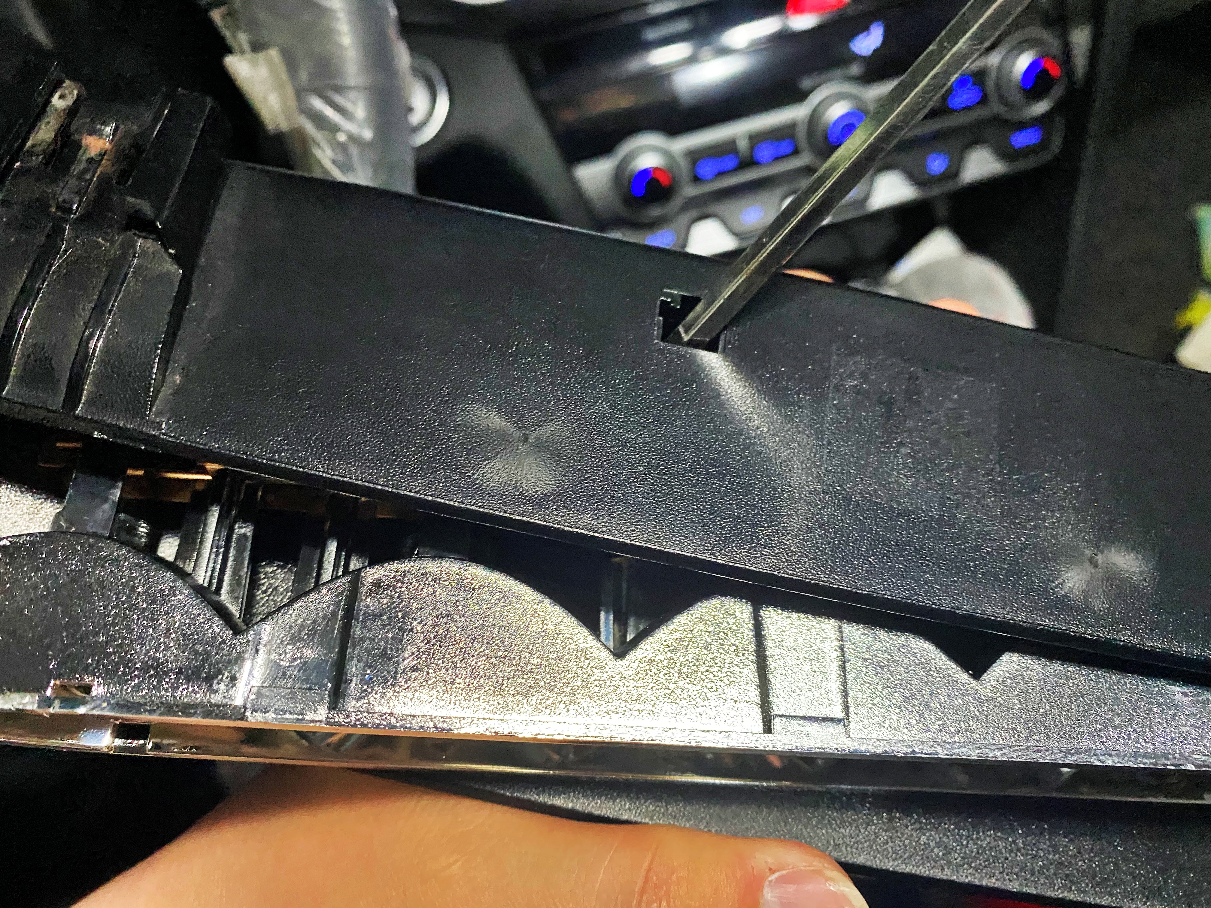 부셔지면 새로 살 각오 하고 재껴주면 빠집니다. 그렇게 양쪽 모서리를 같은 방식으로 재껴주면 생각보다 쉽게 빠집니다. 쉽게 깨지지 않을 굵기입니다. 그냥 상관말고 재껴주면 됩니다.