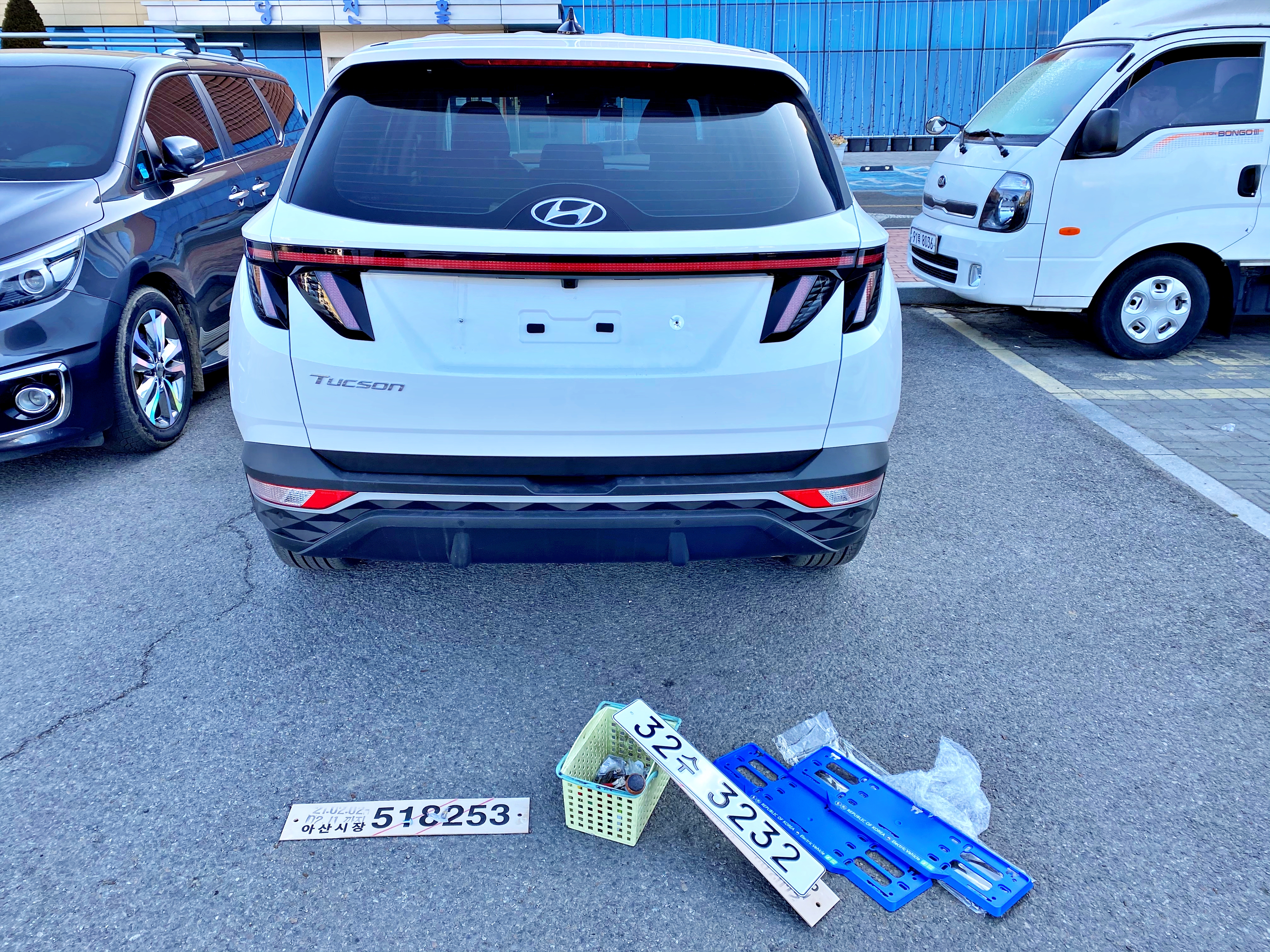 그렇게 본격적인 변태 번호판 장착을 앞두고 있습니다. 신형 자동차에 두 자리 번호판과 전기차용 보조대를 장착하는 매우 변태 같은 조합입니다. 세상에 이런 신형 투싼은 단 한 대밖에 없으리라 생각됩니다.