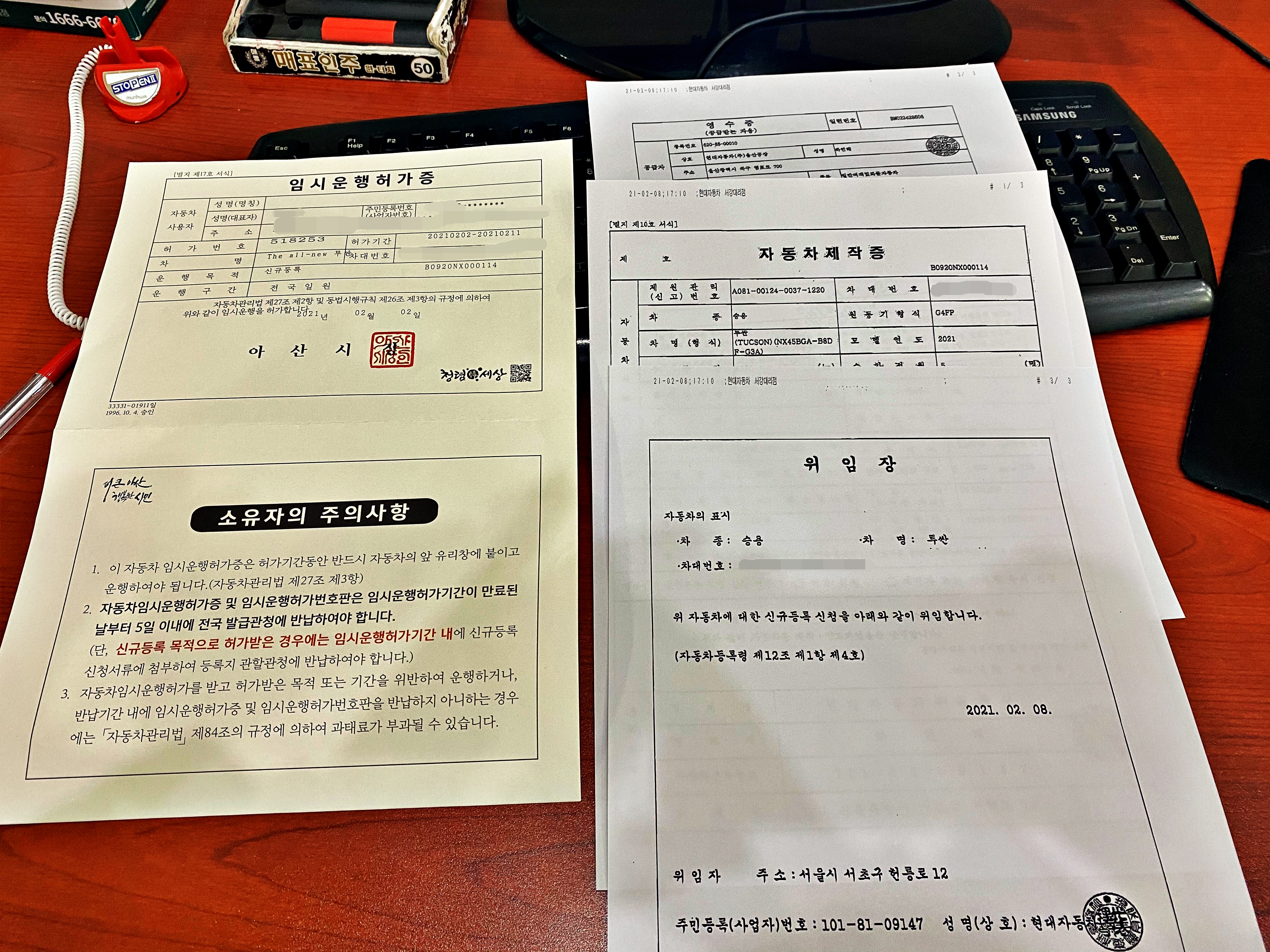 임시운행허가증과 영수증 자동차제작증 위임장