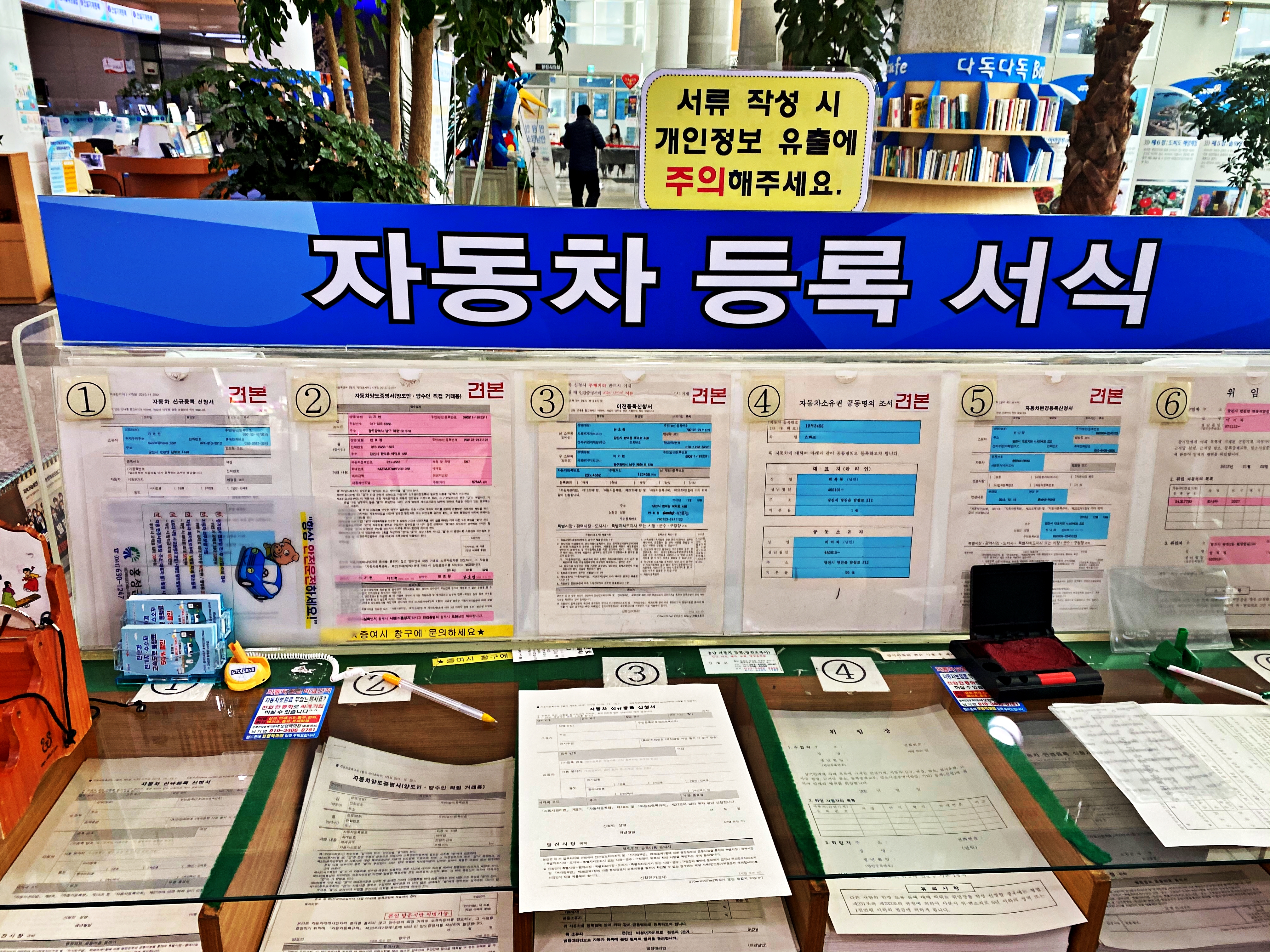 당진시청 민원실 좌측 끝에 차량등록팀이 자리 잡고 있습니다. 그 앞으로 가서 양식을 작성하고 민원인용 팩스로 영업사원에게 제작증과 영수증을 받아 차량 등록에 활용하기로 합니다. 광역시는 구청에. 일반 기초자치단체는 시청 군청에 대부분의 자동차 등록 민원을 처리하는 기관이 존재합니다.