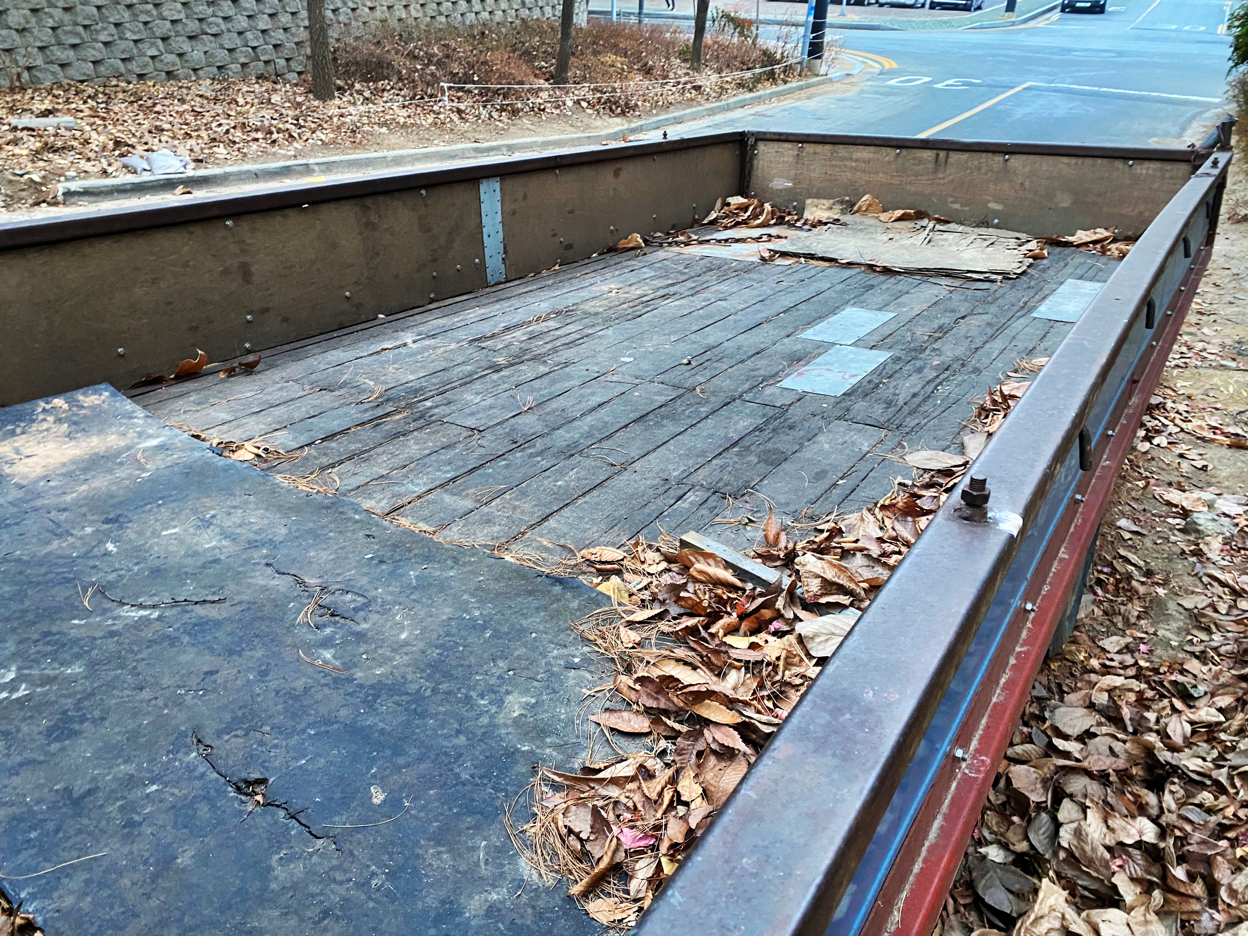 따로 철판 차바닥을 시공하지 않았지만, 적재함에 깔린 목재의 상태가 매우 우수합니다. 중간중간 뗌질을 하기도 했지만, 썩지도 않고 30년 넘는 세월을 버티고 있는 모습이네요.