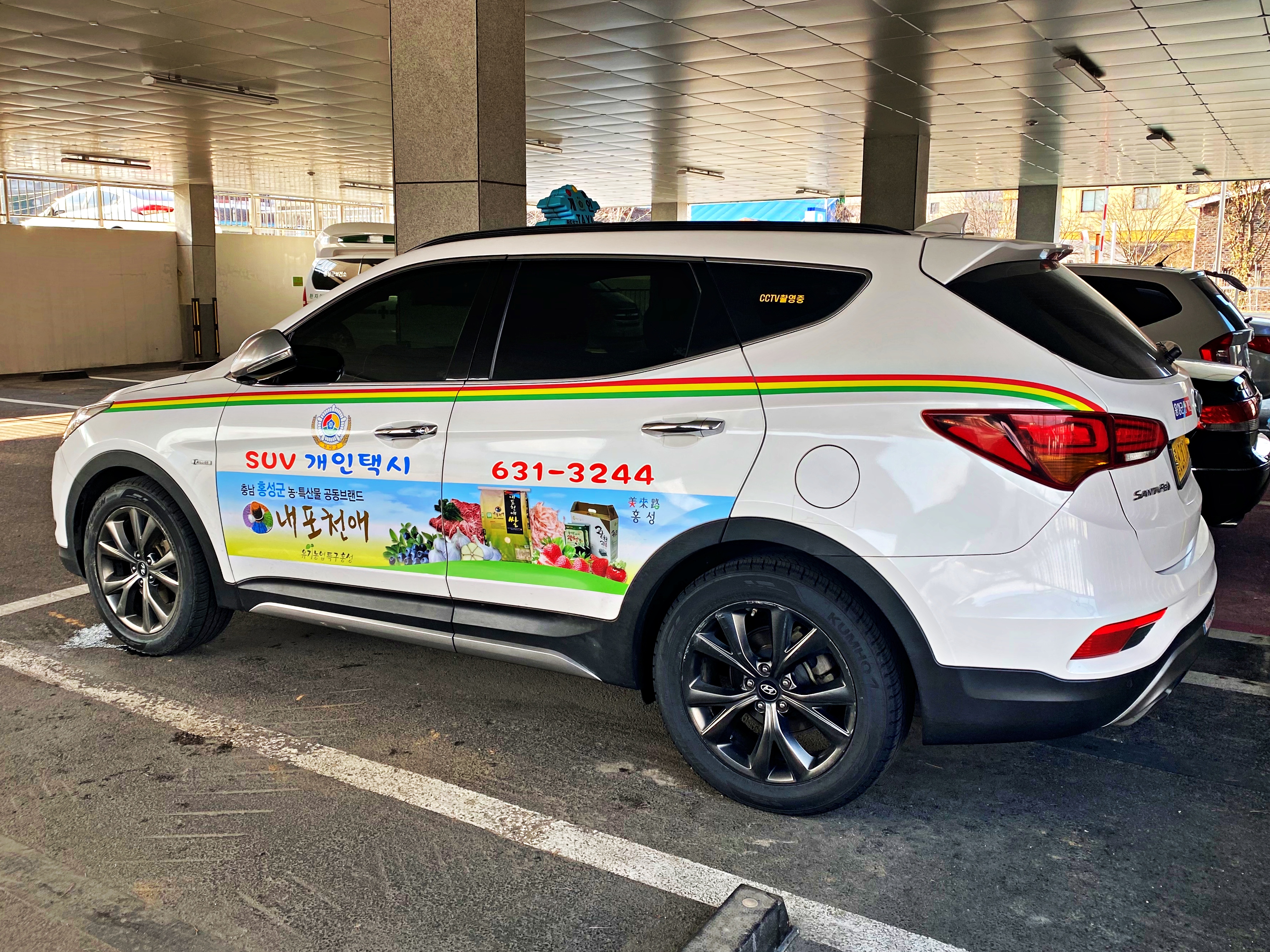 평범한 시골 택시들이 다 그렇듯이 측면에는 지역 농특산물을 홍보하는 광고가 붙어있습니다.