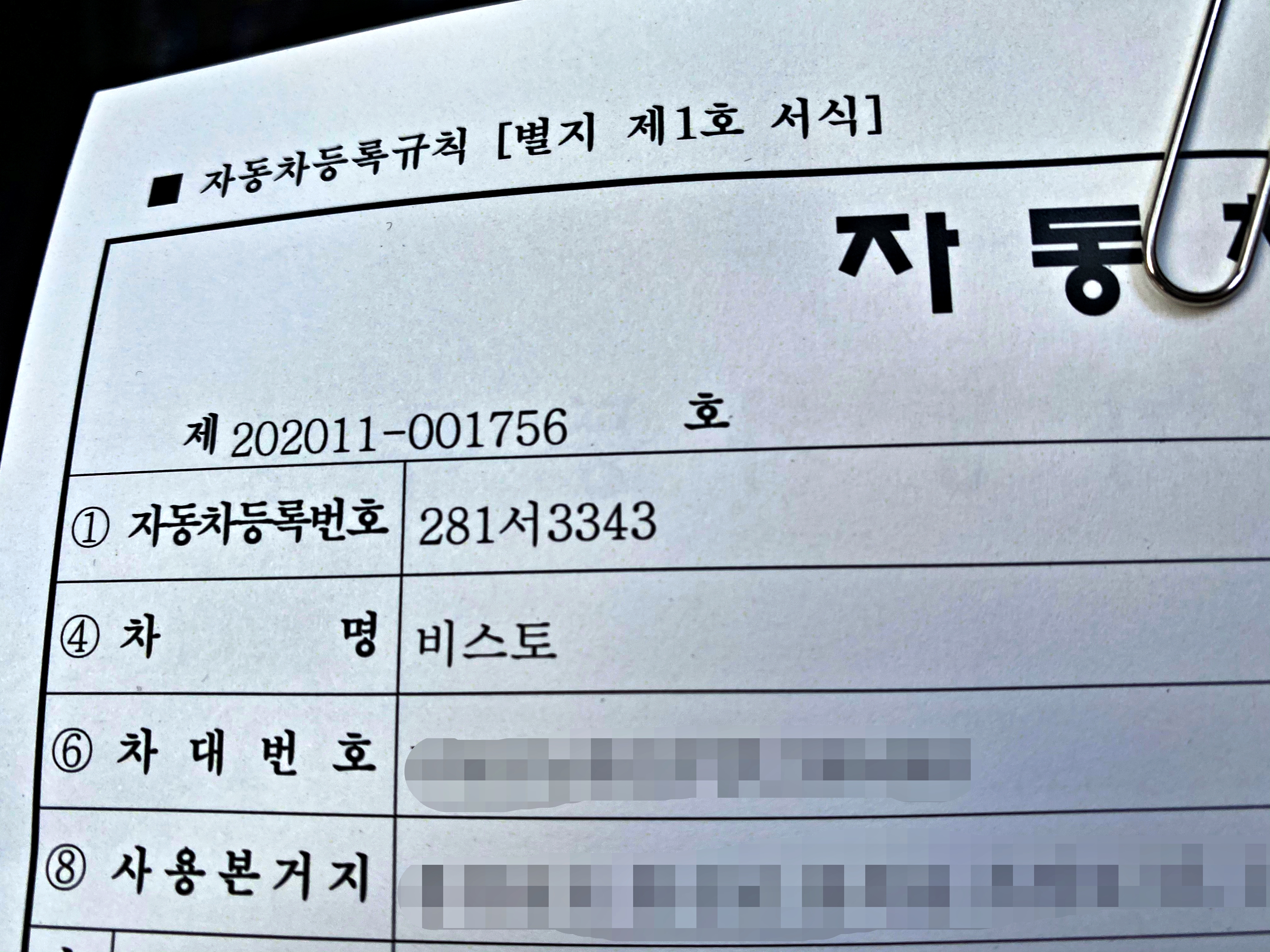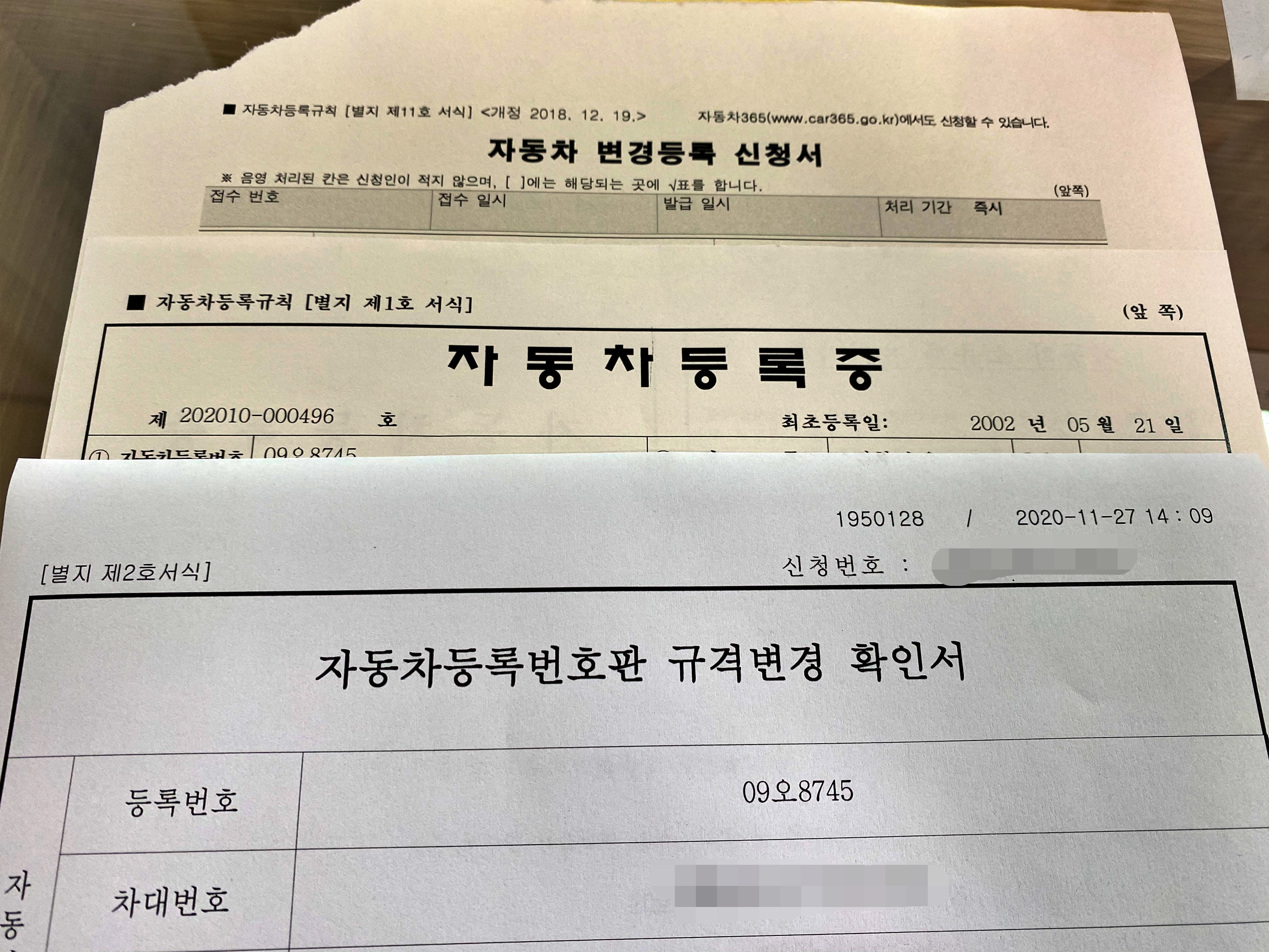 이 서류를 가지고 이제 번호판을 바꾸러 가면 됩니다. 지역에 따라 시,군,구청 혹은 차량등록사업소에 방문하면 되는데, 번호판 변경 신청시 이 서류를 꼭 보여줘야 합니다. 물론 보여줘도 흔한 사례는 아니다보니 담당 공무원이 가능한지 여기저기 물어보곤 하는데 결론은 됩니다. 안된다고 하면 규격을 바꿔왔다며 세자리 번호판으로 바꿔달라고 말씀하세요.