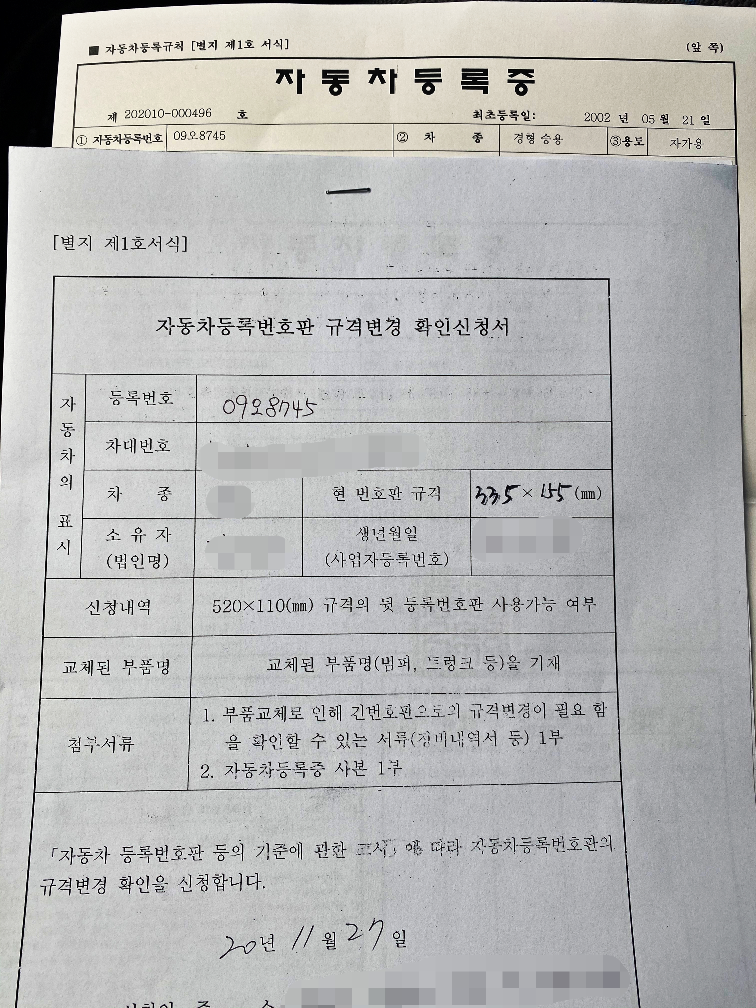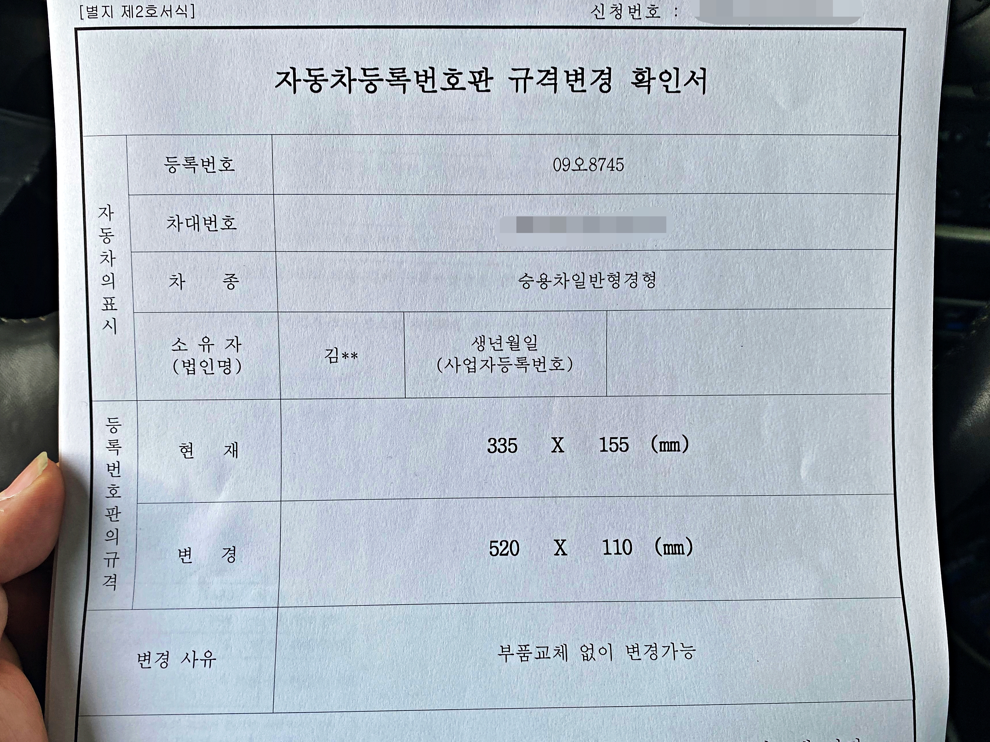 물론 수입차라던가 년식변경으로 뒤 번호판 규격이 바뀐 차량에 한해서 부품을 교체했다는 확인서를 가지고 있다면 교통안전공단 검사소에 내방하여 규격 변경을 신청하면 긴 번호판을 부착 할 수 있었습니다. 그 방식으로 06~07년 사이 판매되었던 차량들이나 구형 수입차들만이 번호판 규격을 변경하였으나, 지난 2017년부터 충분히 번호판을 부착 할 수 있는 공간이 있으면 별다른 부품교체 없이 규격변경을 승인해주고 있습니다. 고로 자동차랑 등록증 그리고 소유자 신분증만 가지고 검사소로 향하면 됩니다.