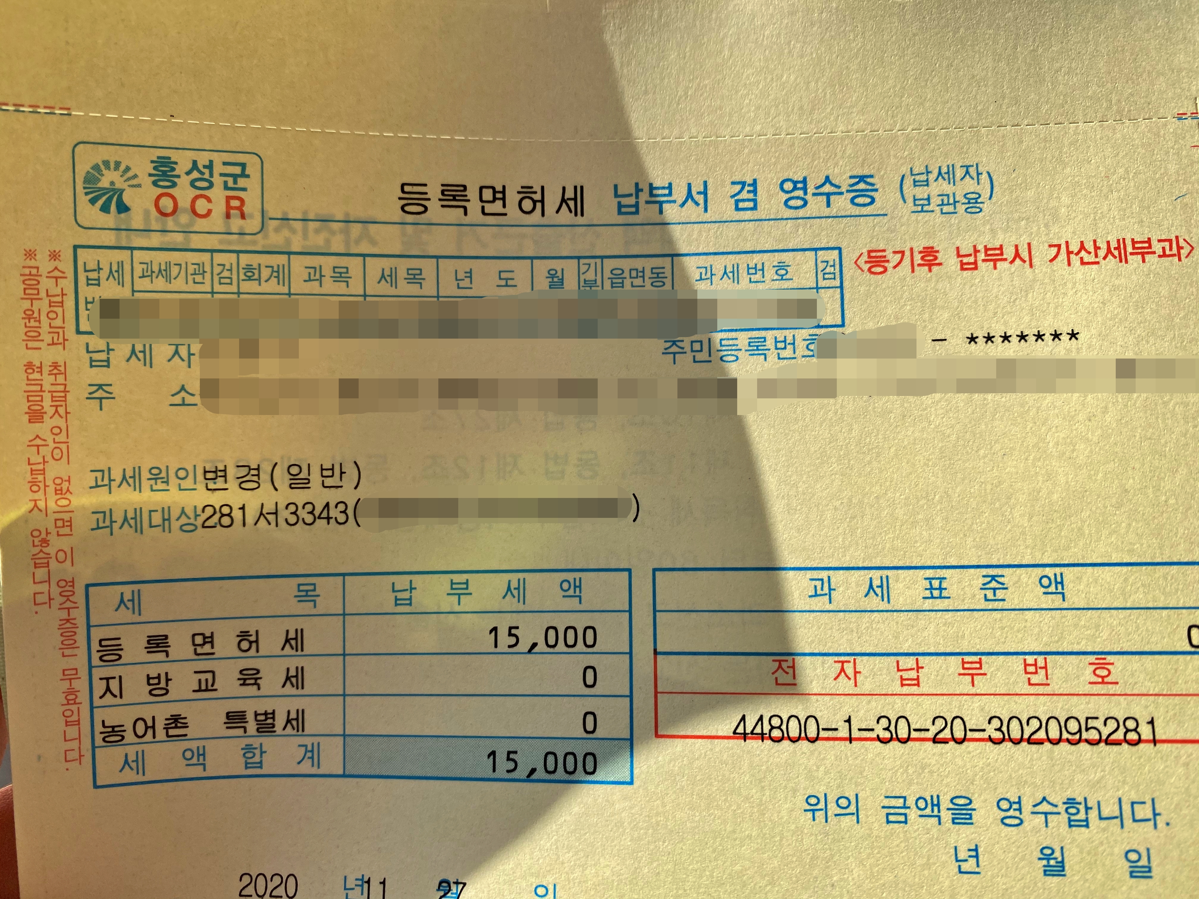 등록면허세 15,000원과 자동차등록증 발급비용 1,300원을 군청에서 납부합니다.