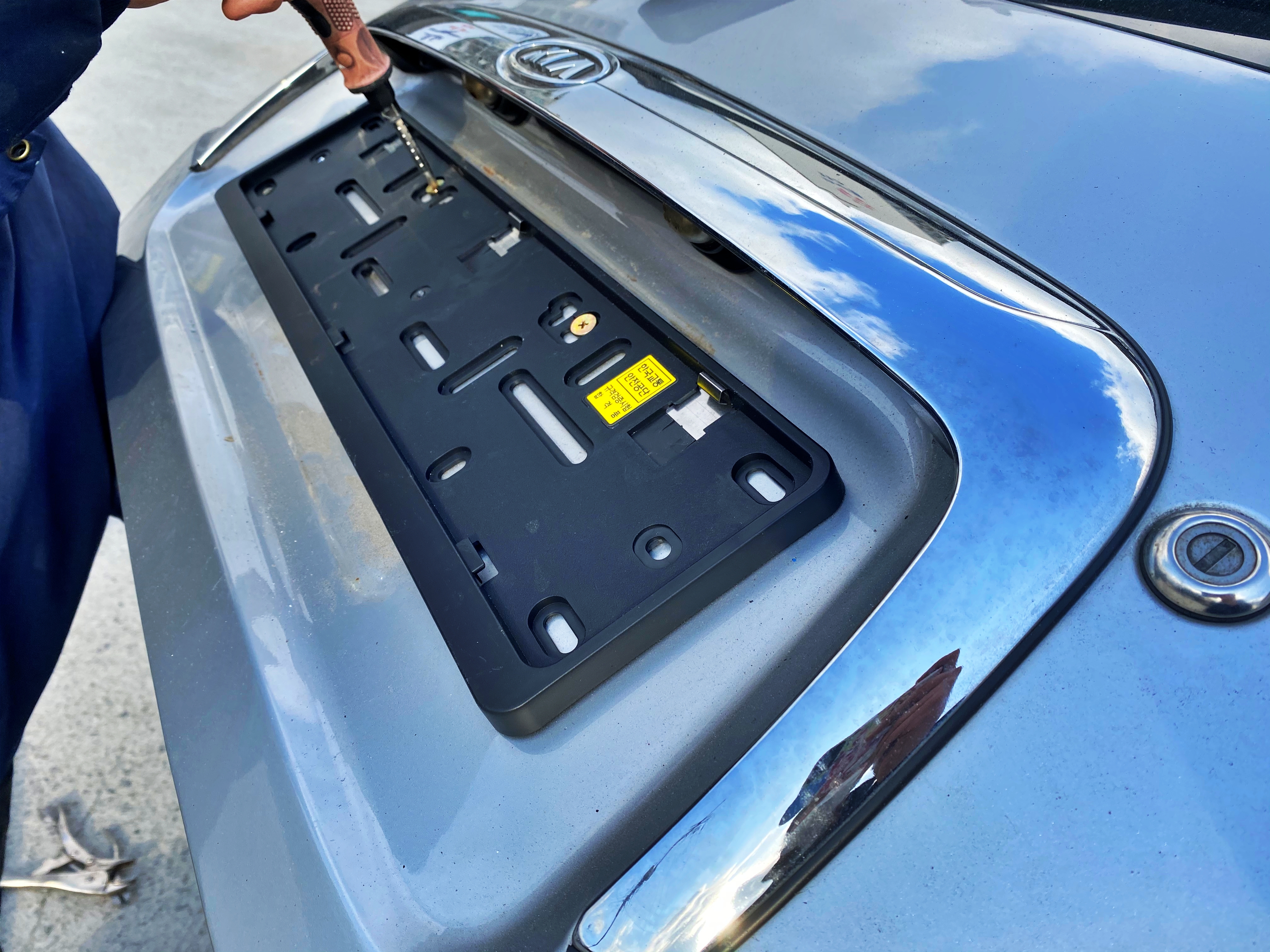 수입차라면 모르겠는데, 국산차라면 차라리 국산차용 플레이트나 너트를 가지고 가서 휘장사에 있는 플레이트를 장착하시는게 수월할겁니다. 국산차용 플레이트의 고정 볼트 자리는 옛 규격에 맞게 뚫려있습니다. 수입차용은 일부 가공이 필요하다고 하는데 이 방식대로 진행한다면 별다른 가공 없이 봉인을 장착 할 수 있다는 얘기가 되겠죠.