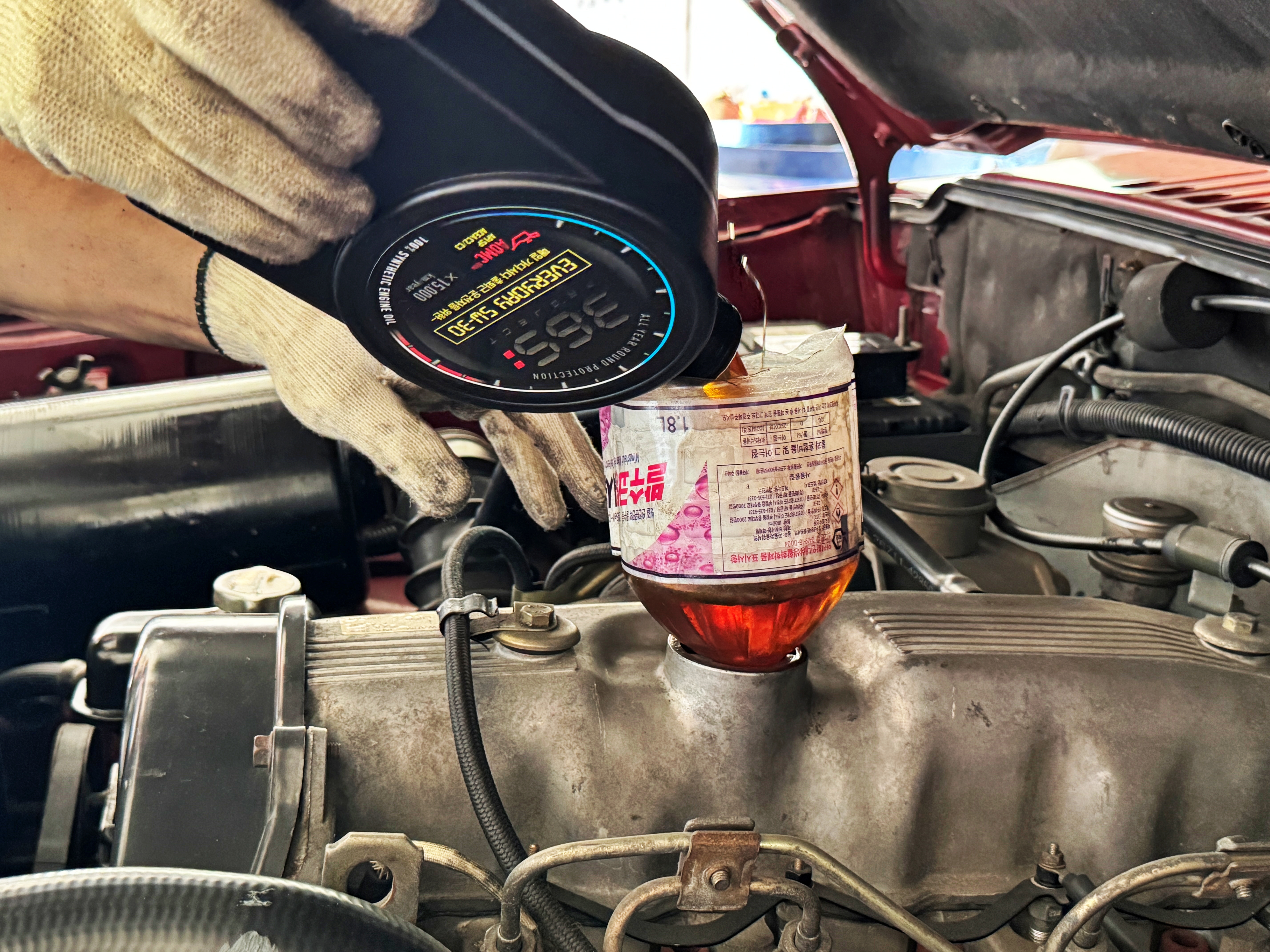 전에 서울 오일마켓에서 엔진오일을 교체한 이후 꽤 오래 놔뒀던 갤로퍼의 엔진오일을 교체해 줬습니다. 이번에도 엔진오일은 티코와 동일한 불스원 365 에브리데이 5W30. 티코에 주입하며 남은 물건이 좀 있어서 갤로퍼 역시 이 오일로 교체했습니다.