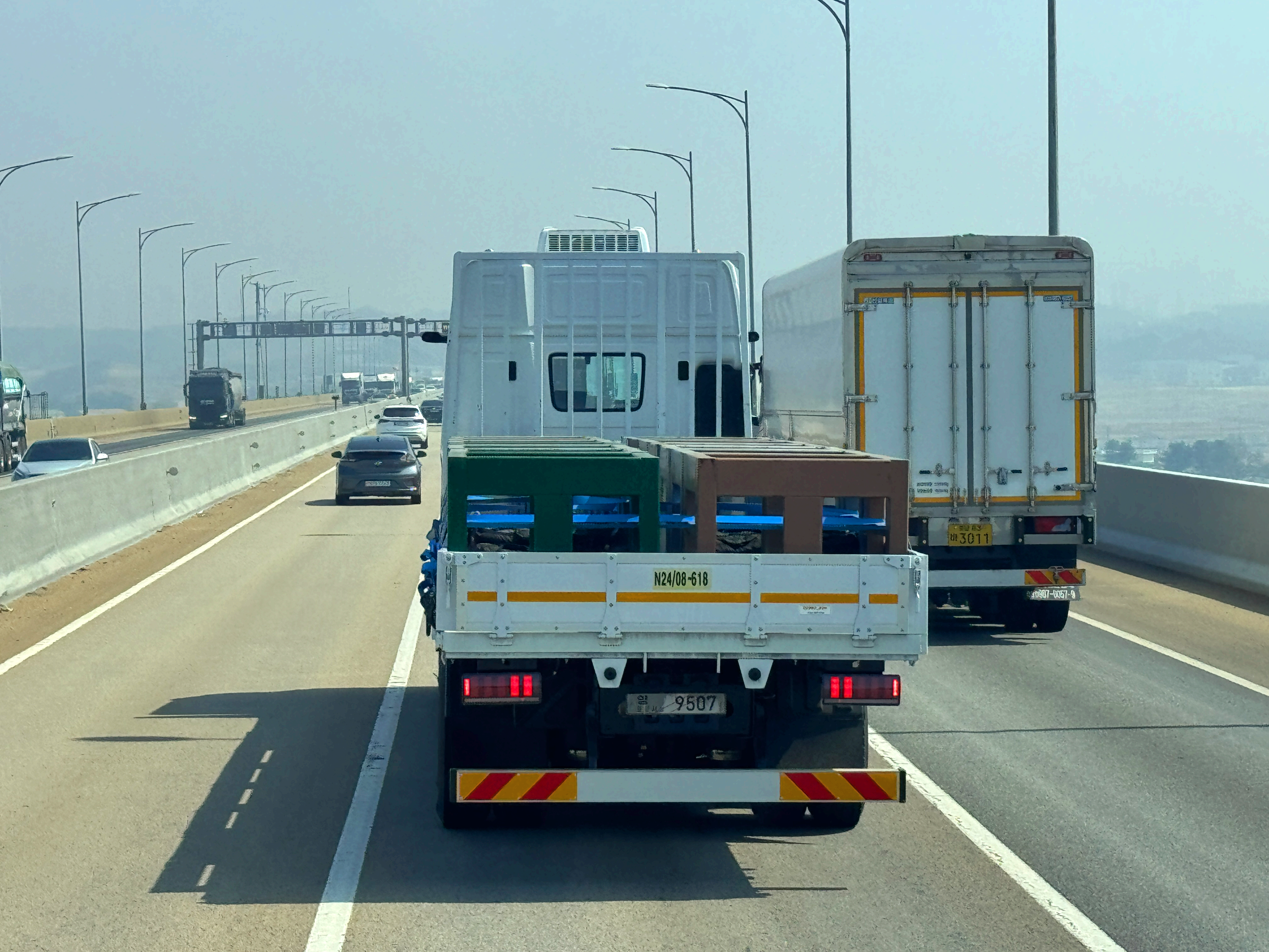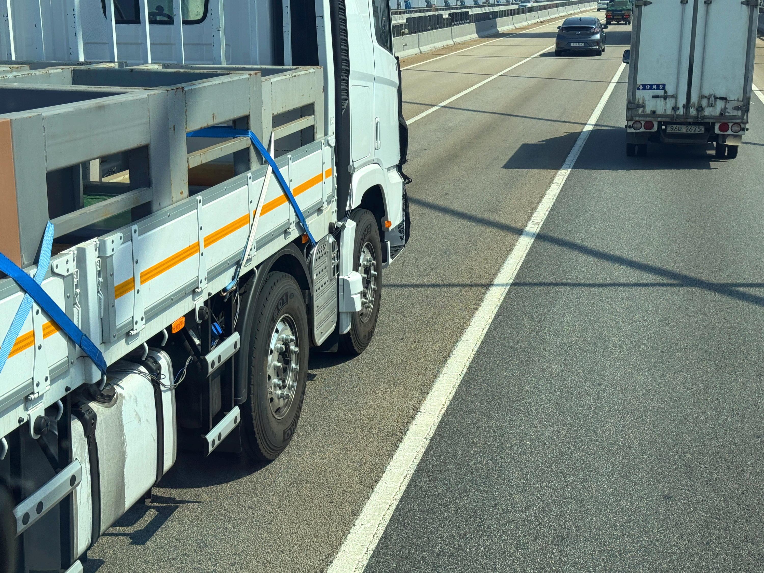 서해대교 상행선을 올라가고 있는데 가볍게 치고 올라오는 위장막이 쓰인 차량이 보였습니다.