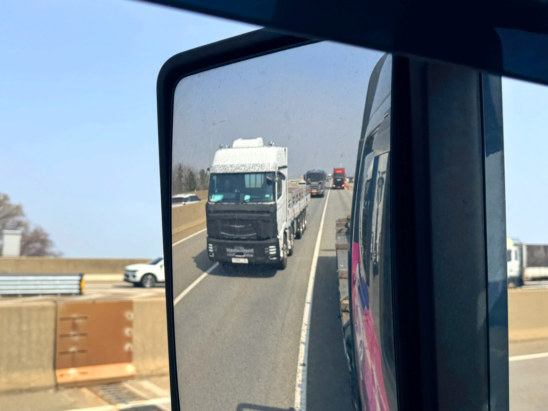 지난번에 본 차량과 달리 이번에 본 차량은 25톤 중축에 하이탑이 적용되었고 소문만 무성했던 전자식 사이드미러. 흔히 말하는 미러캠이 적용된 차량이었네요. 1축과 2축 사이에 무슨 센서가 또 하나 생기는 모양인데 가까이에서 차량을 볼 수 있어 흥미로웠습니다.