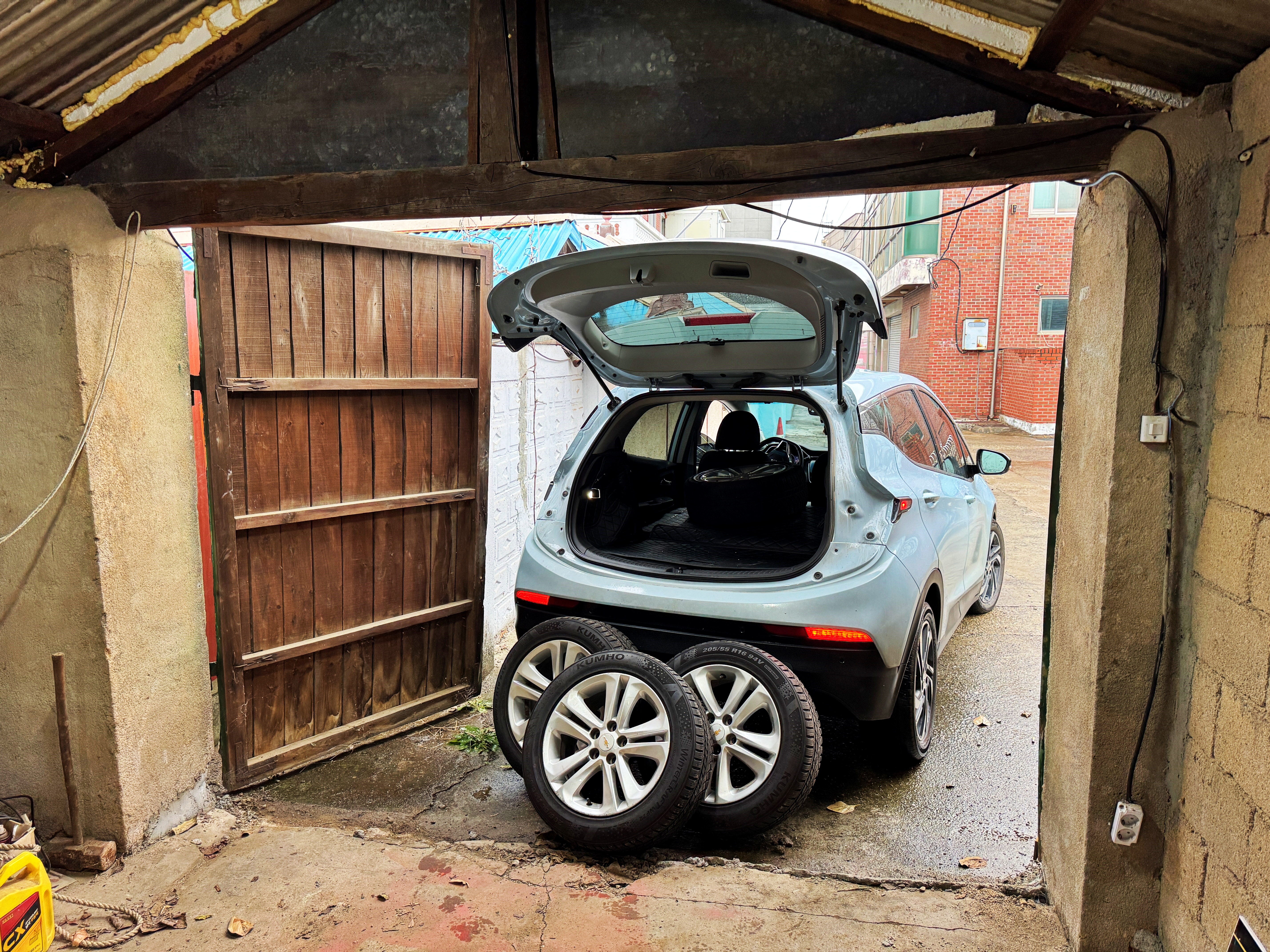 첫눈이 내리던 11월 27일. 그간 미국산 대우 전기차에 윈터타이어를 끼우지 못하고 있었던지라 시간이 생겨 휠타이어를 교체하려 했습니다. 그래서 작년에 구입하여 겨울을 보냈던 올 뉴 크루즈용 16인치 휠과 16인치 스노우타이어를 합덕 차고에서 꺼내어 교체하려 했는데 교체하러 가는 길에 사고가 발생했네요.