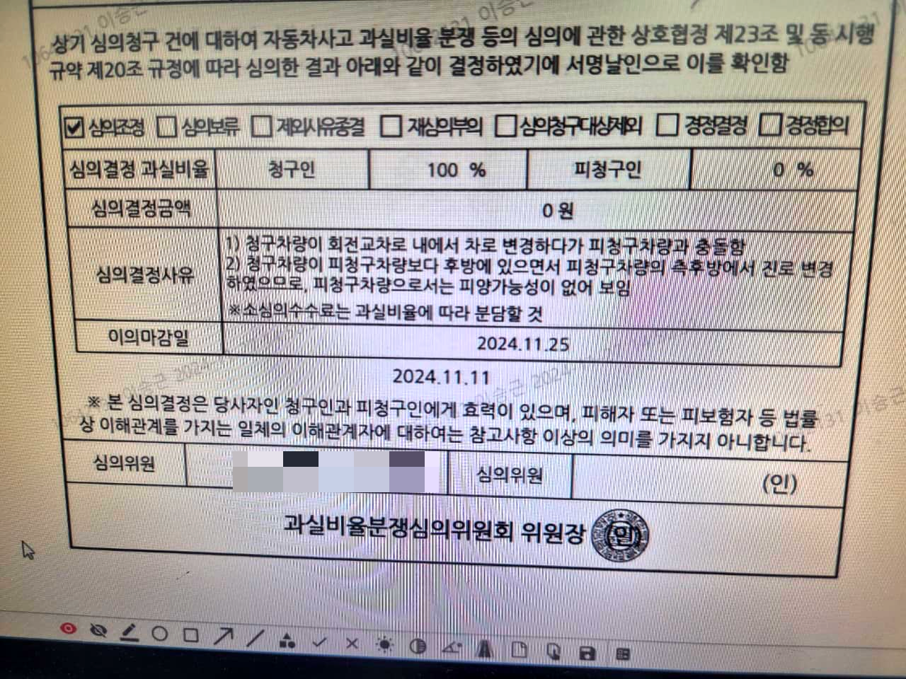 그렇게 별거 아닌 사고로 혼자 꼬장 부려서 3개월간 질질 끌다 무과실로 끝났는데 심의결정사유가 궁금하여 오늘 우리 담당자에게 보여달라고 부탁하니 보여주더군요.