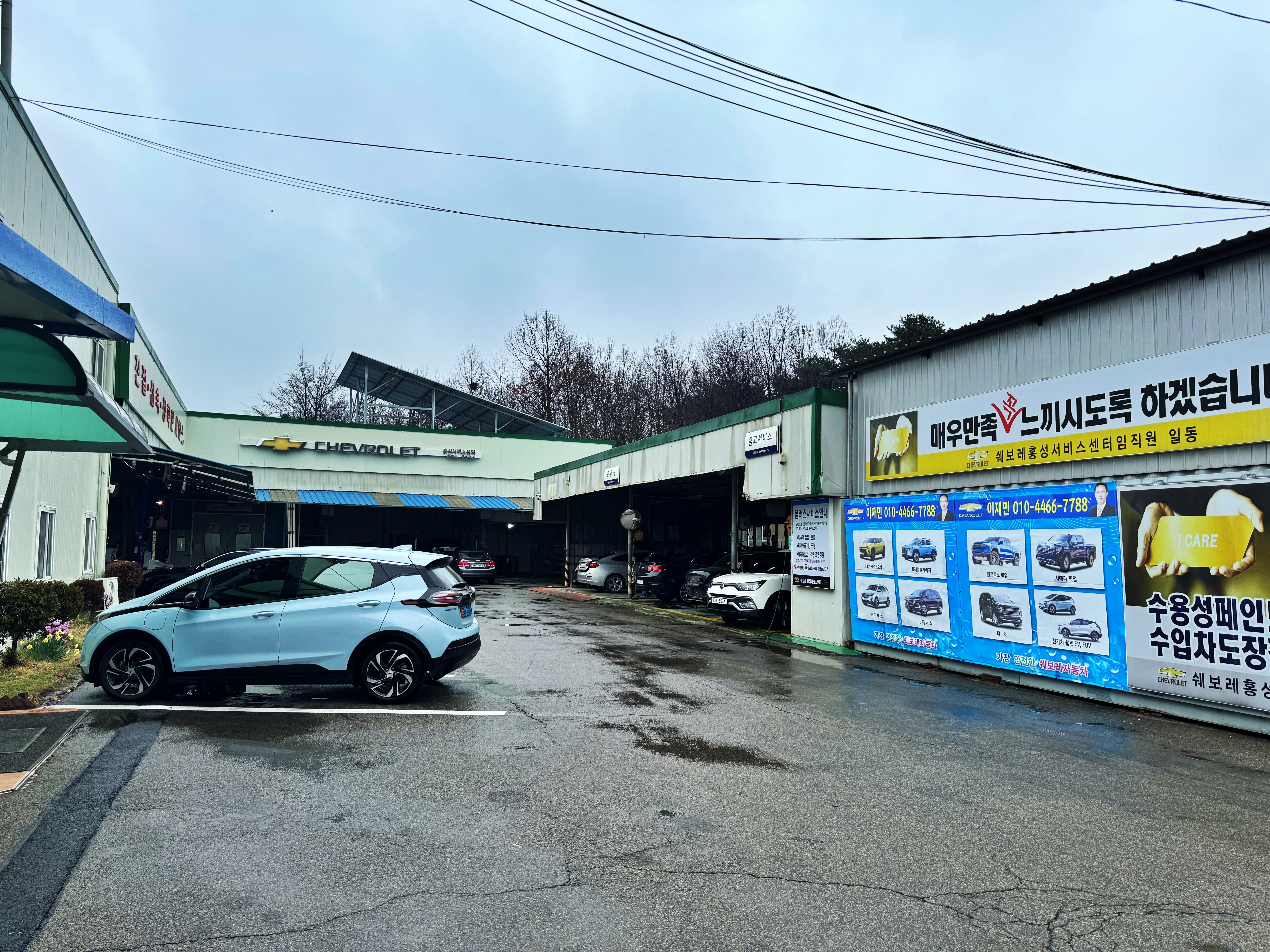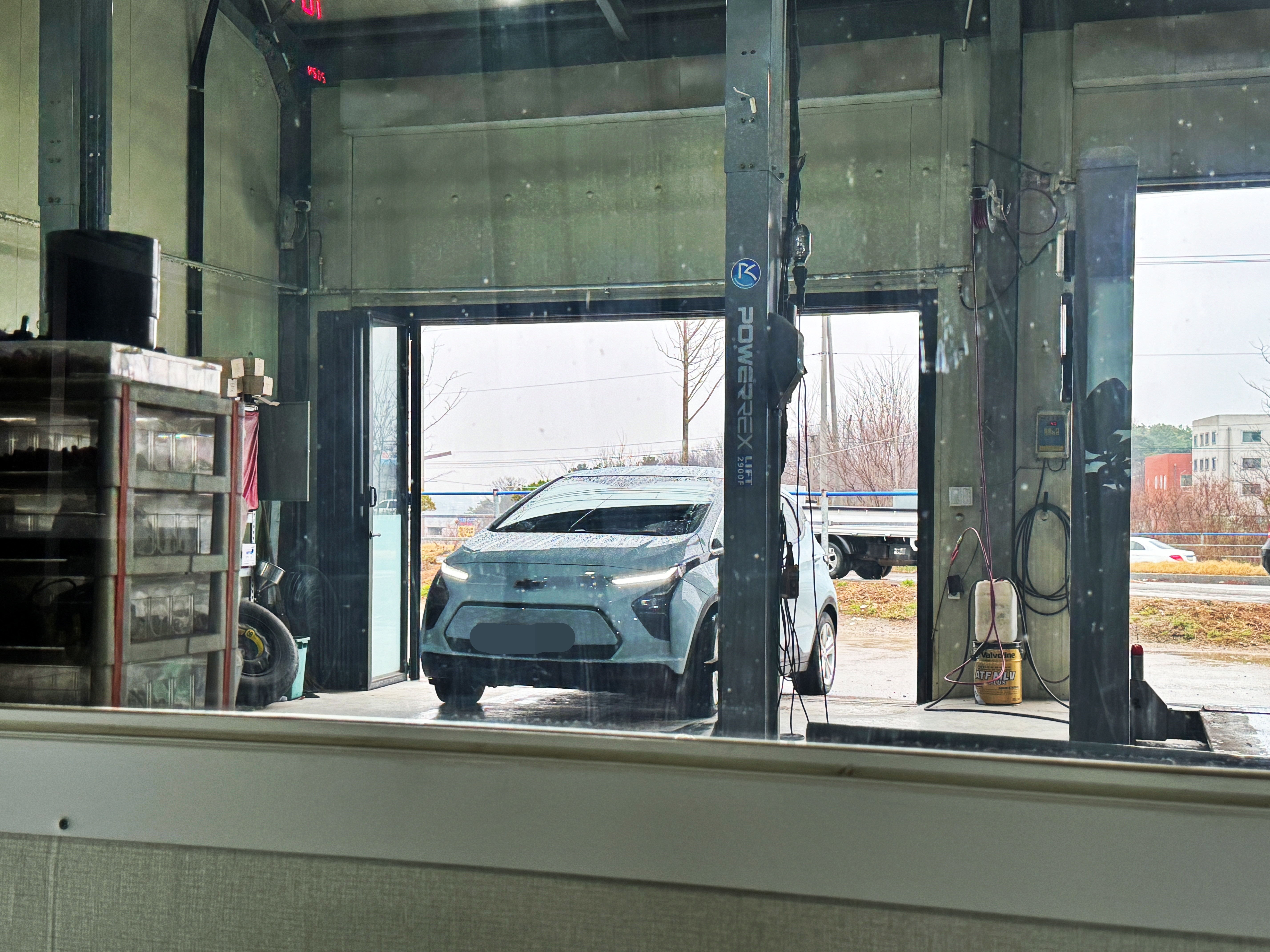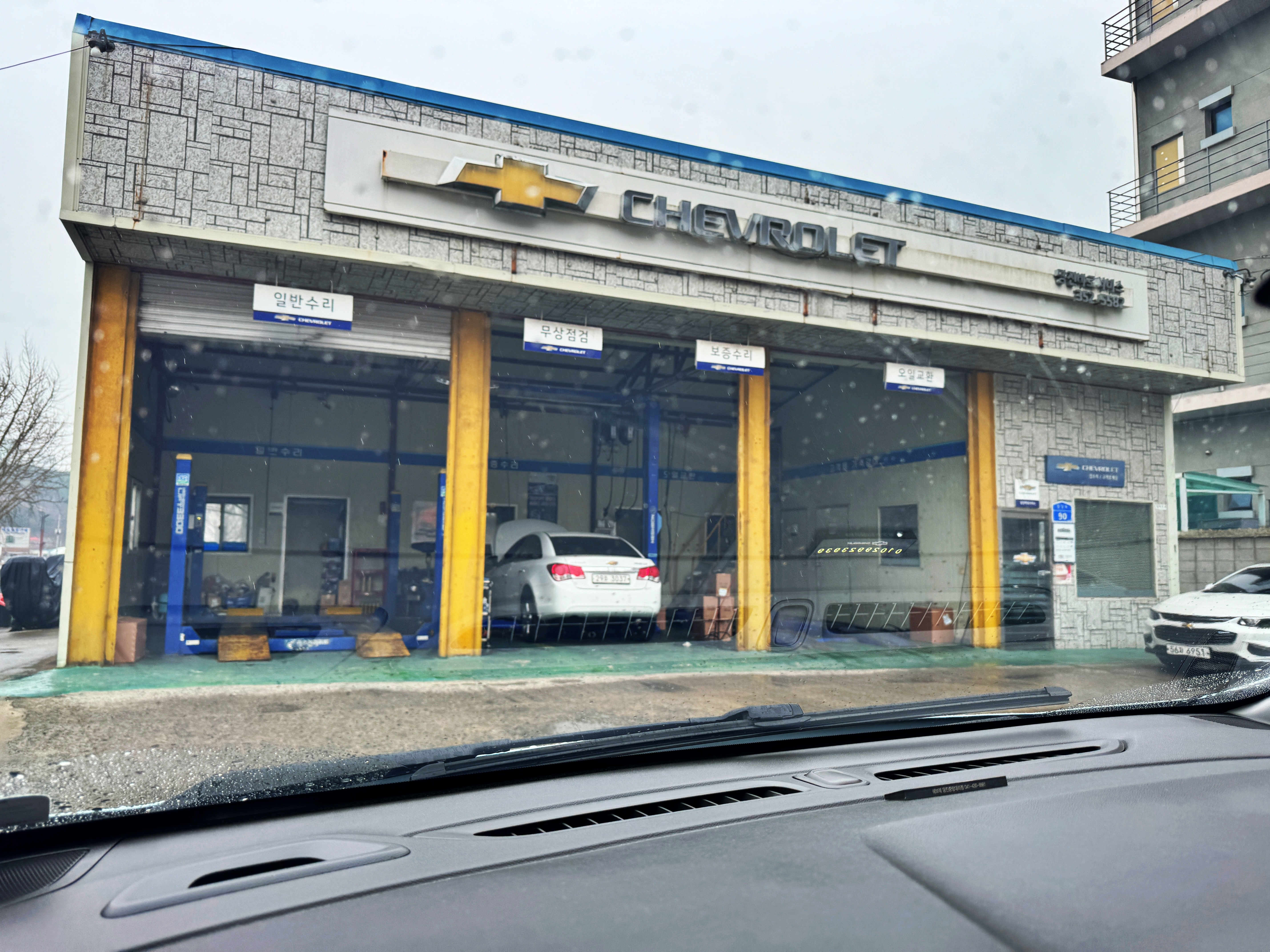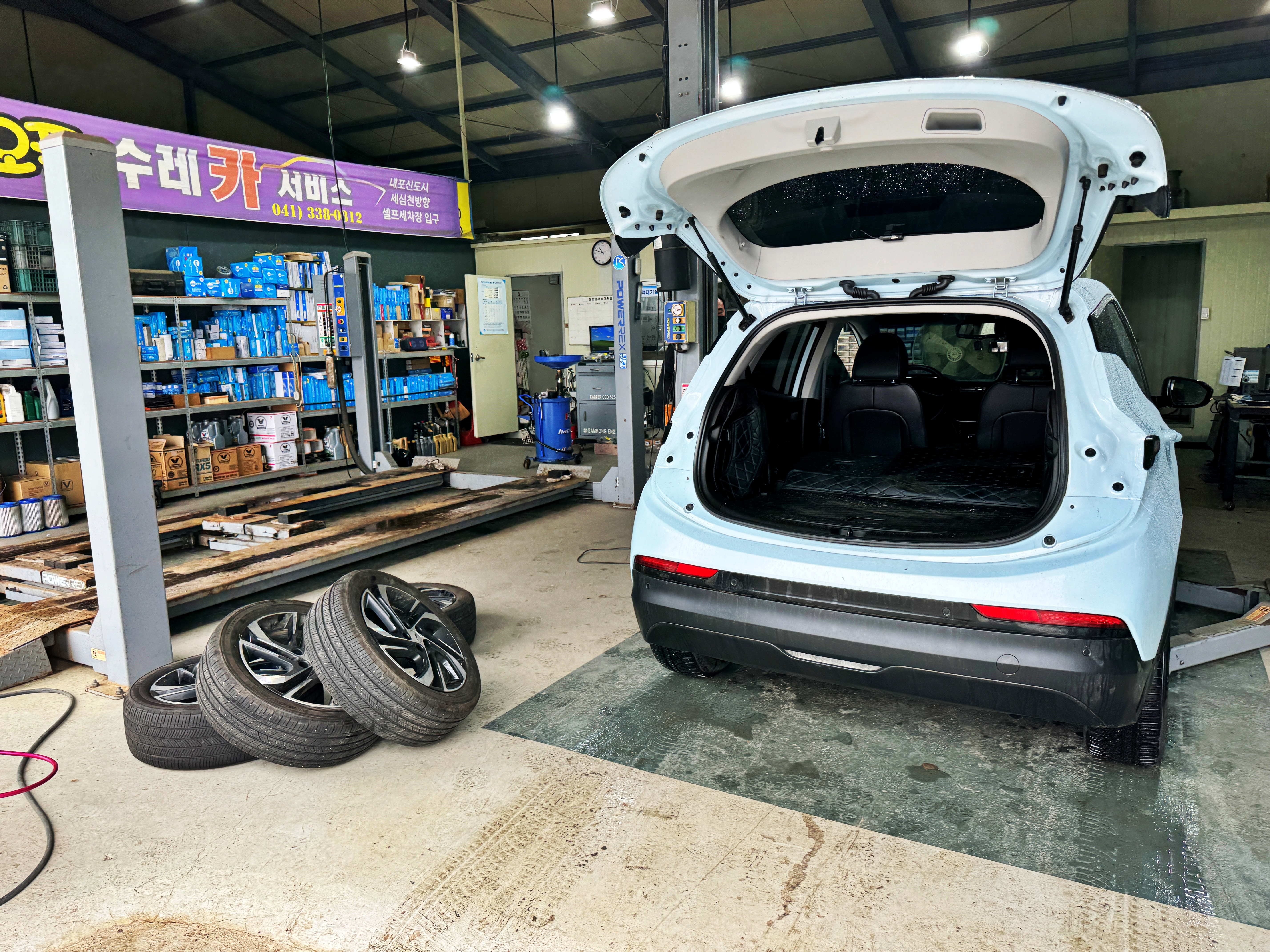 좌측 편에는 수평을 맞추기 위해 벽돌 위에 차를 올려두었네요.