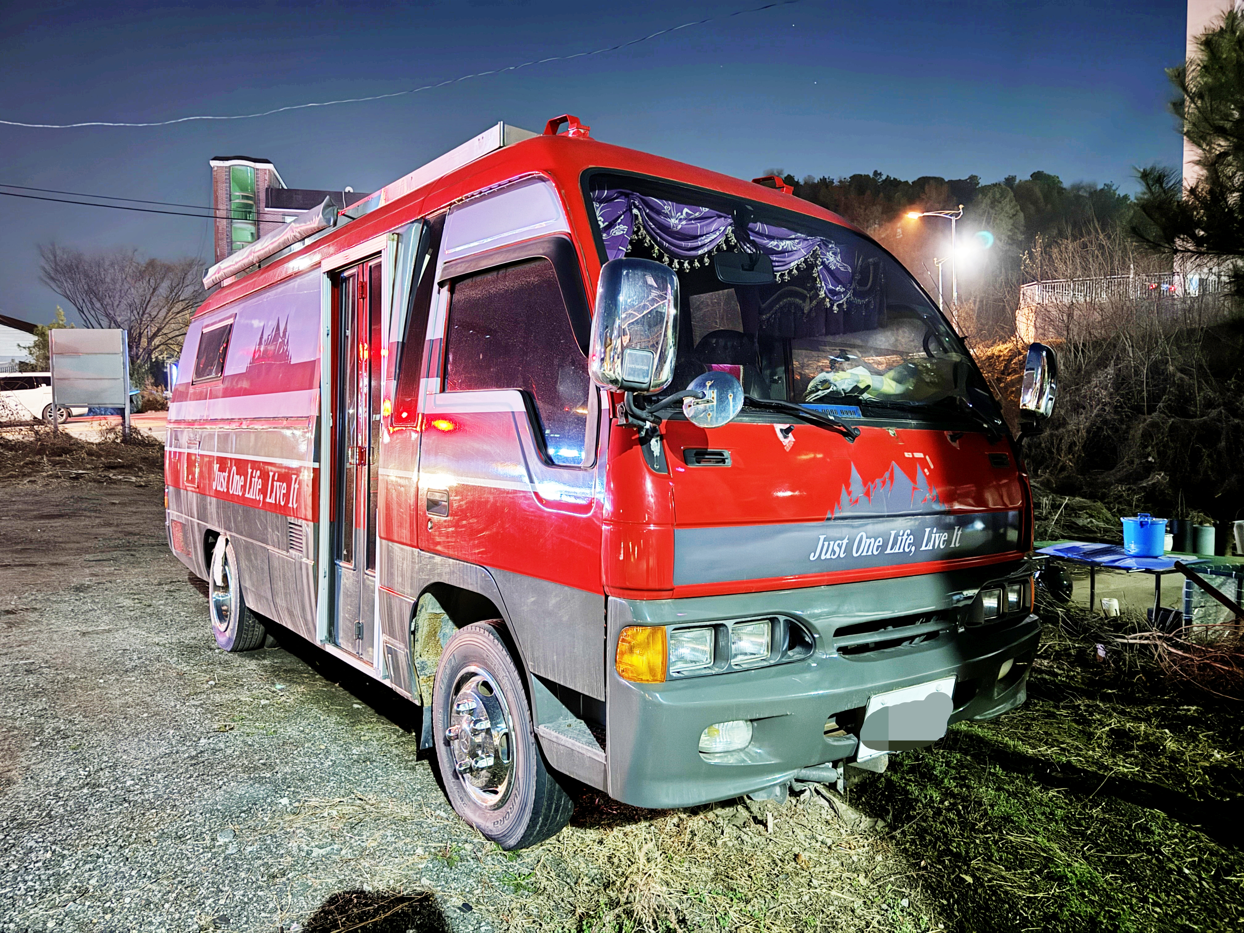 사이드어닝도 달려있고 무시동에어컨과 태양광 패널도 달려있는 것으로 보아 이 차량에 꽤 많은 투자를 해놓고 애지중지 관리하고 계신 듯 보입니다. 저감장치의 장착 여부는 알 수 없지만, 주말에만 주행할 테니 큰 무리는 없을 겁니다.