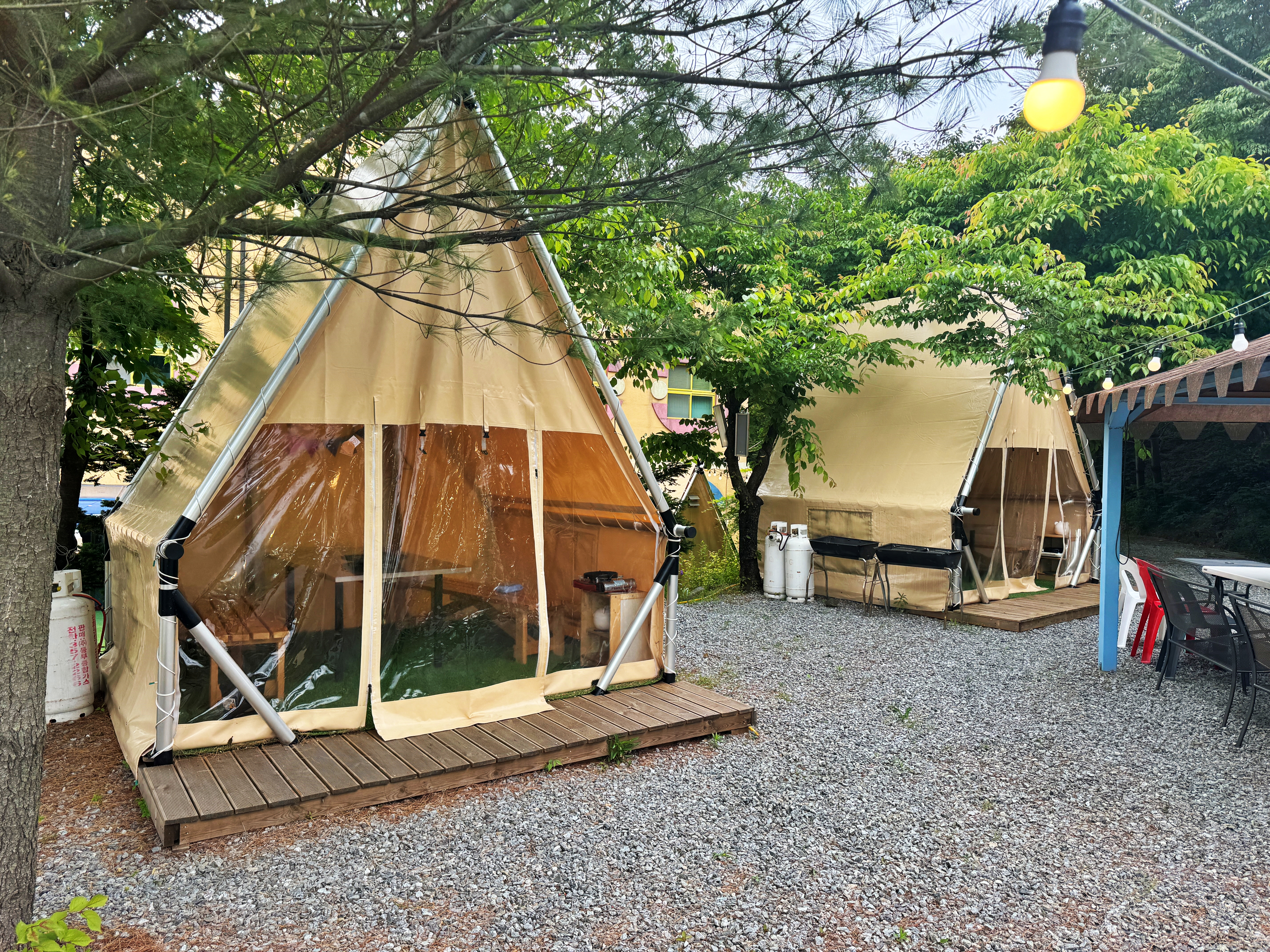 이 텐트 안에는 식탁과 의자 고기를 구울 수 있는 불판이 설치되어 있습니다. 텐트 안에서 냉난방 역시 가능하고요. 어린이집 놀이터가 있었던 자리를 글램핑 텐트가 메우고 있었습니다.
