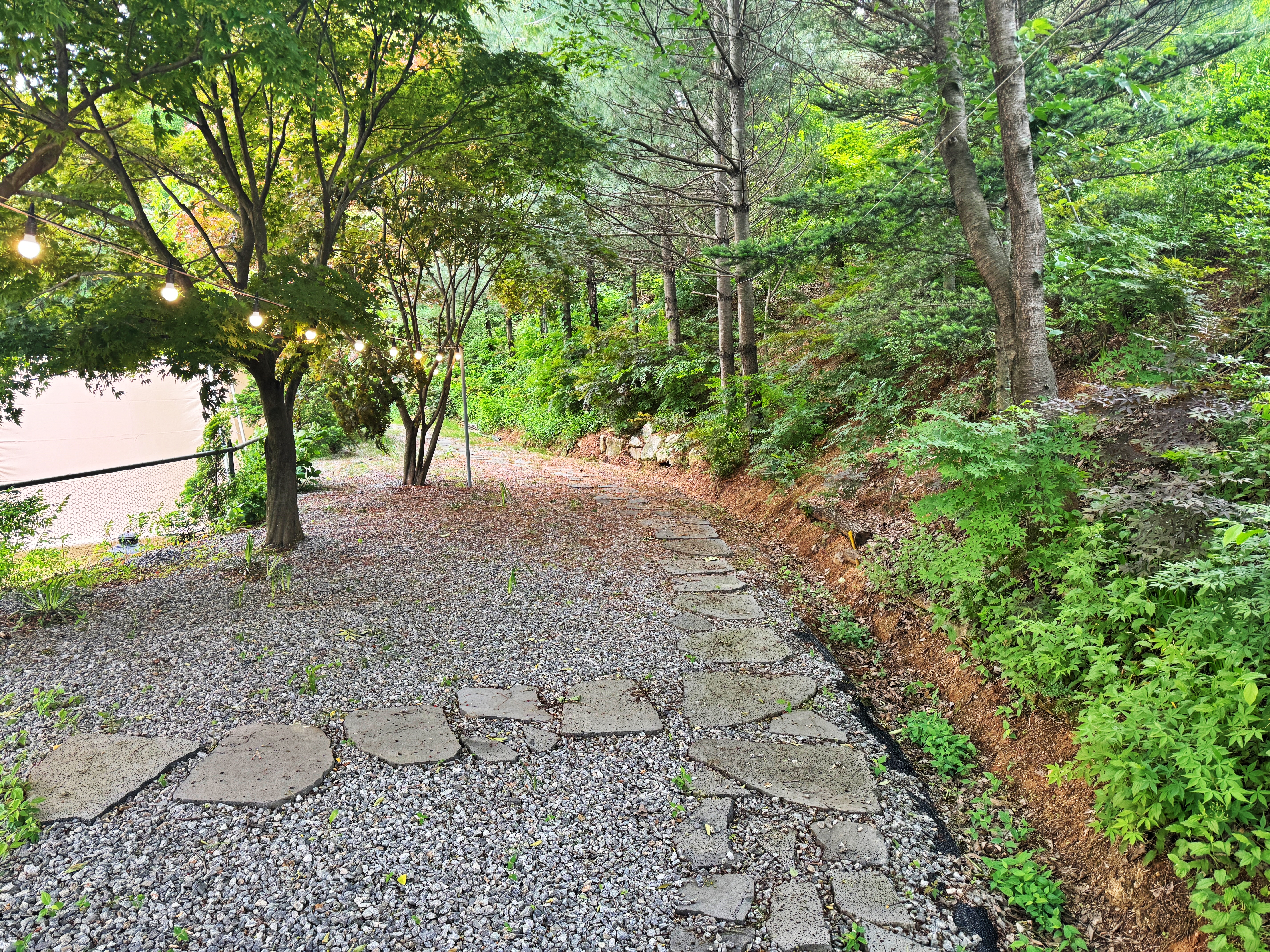 산책로로 들어가는 길목에 잔디 대신 자갈이 깔려있는 진짜 캠핑장 느낌의 텐트도 있었습니다.