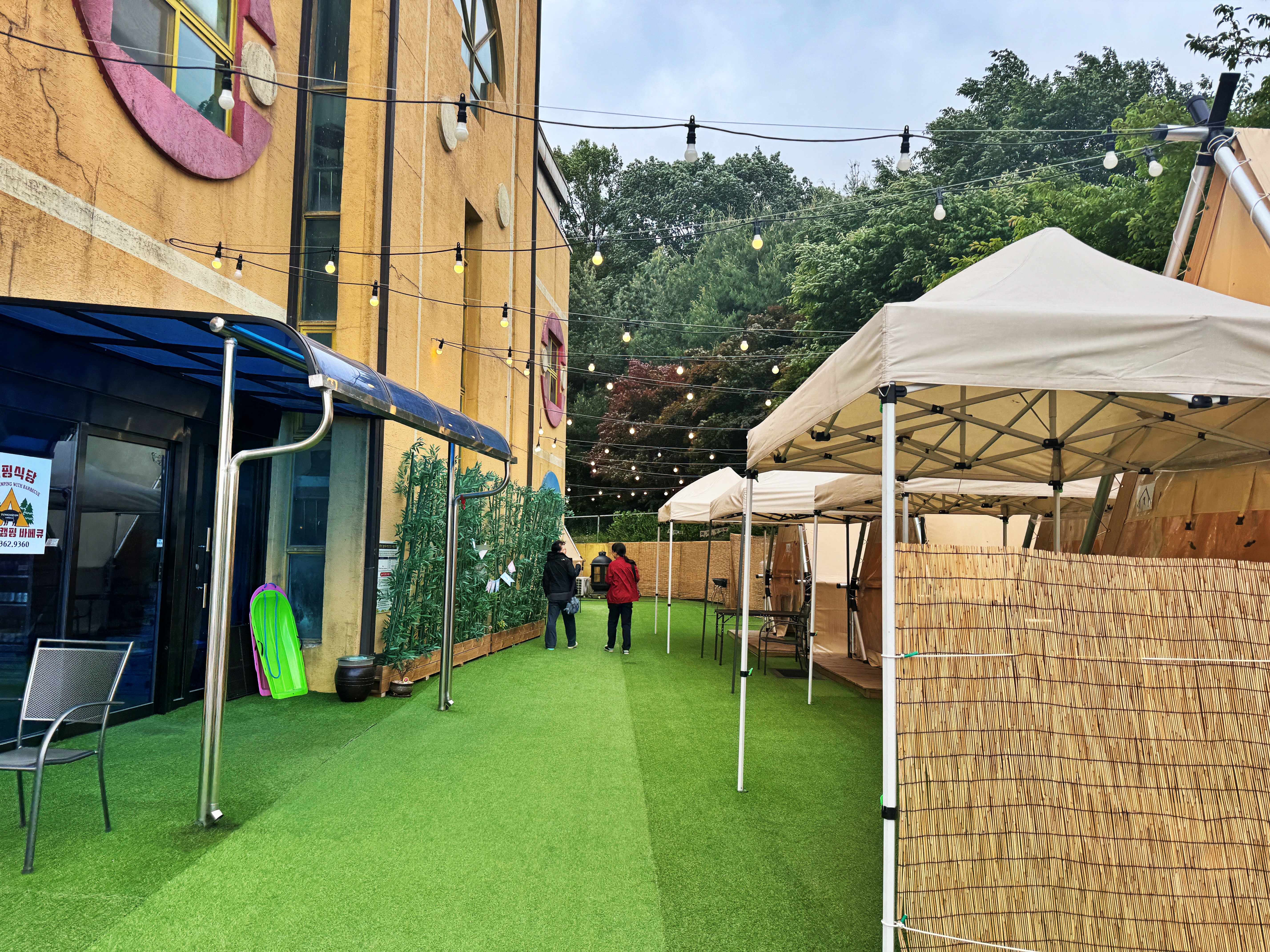 인조잔디가 깔린 건물 측후면으로 글램핑 텐트가 설치되어 있었습니다.