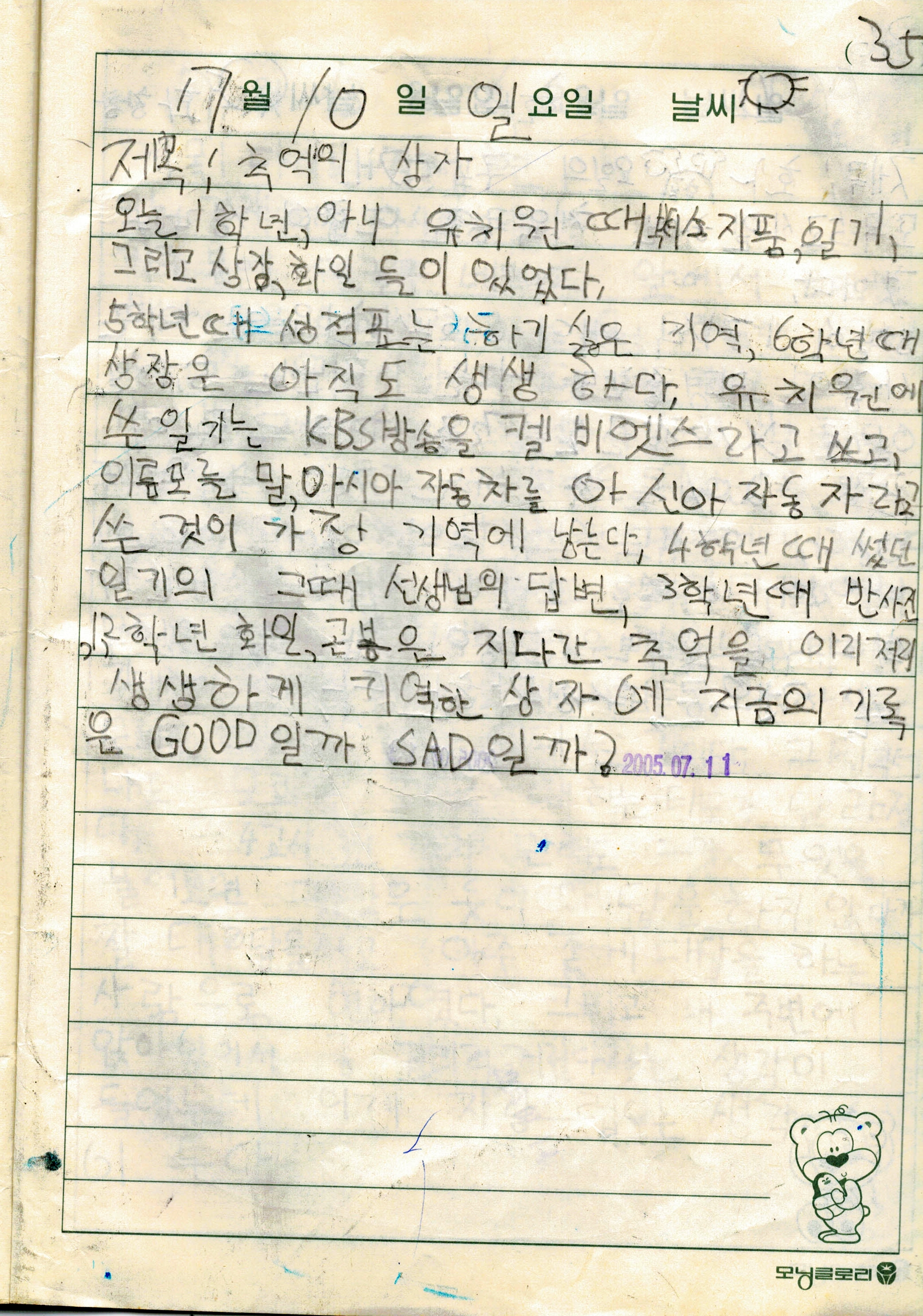 | [초딩일기] 2005년 7월 10일 제목 : 추억의 상자 (0) | 2022.09.20 |