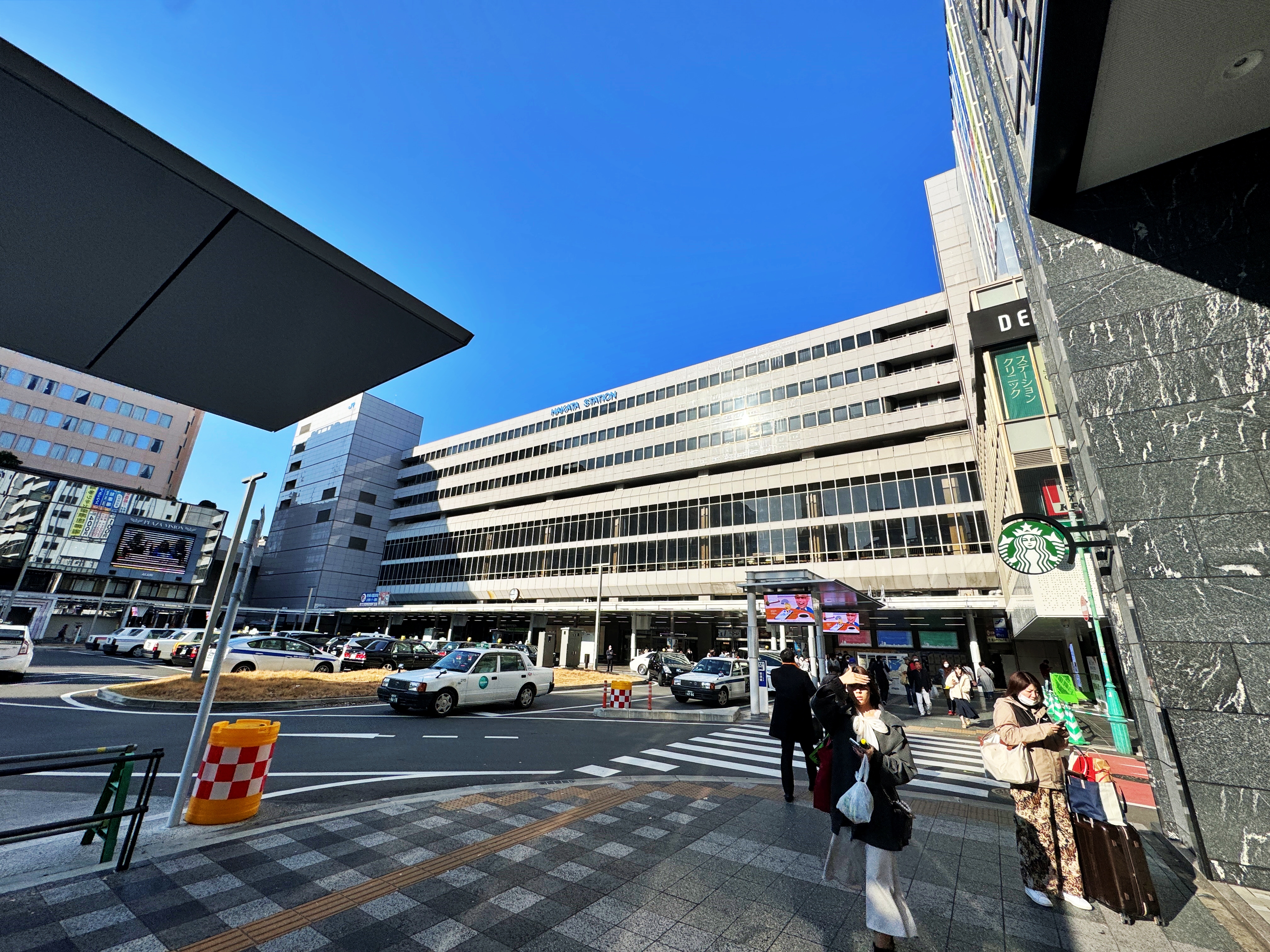 화려한 하카타구치 반대편의 치쿠시구치 방면 출입구네요. 그러고 보니 아침 버스투어가 출발하는 시간대입니다. 역 앞에 관광버스가 세워져 있고, 버스투어를 신청한 사람들을 기다리는 한국어로 된 깃발들도 좀 있었네요. 다음에 렌터카 없이 다른 누군가랑 같이 가게 된다면 버스투어로 벳푸나 유후인 지역에 가도 괜찮을 것 같습니다.