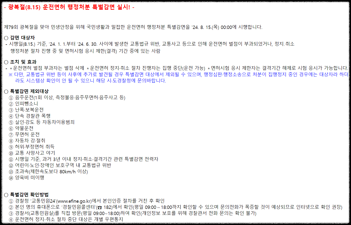 제79회 광복절을 맞아 민생안정을 위해 운전면허 행정처분 특별감면을 시행한다고 합니다.