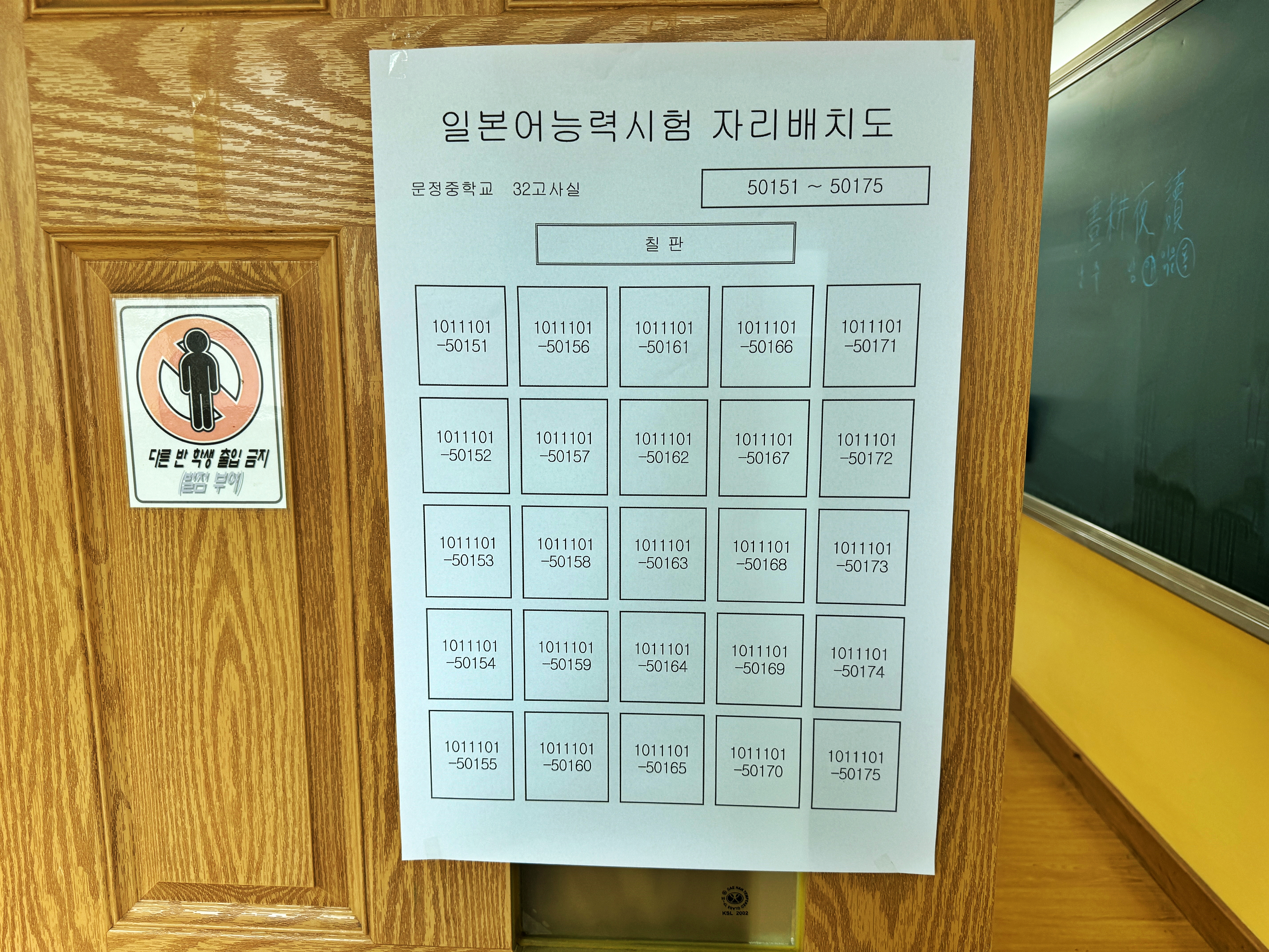고사실당 24~25명씩 배정되어 있습니다. 이미 다른 급수의 시험을 치른 경험이 있으실 N1을 보러 오신 분들이 절대다수고, 저 같은 늅늅이들은 1층에 배정되었네요. 수험번호를 확인한 뒤 고사실로 들어갑니다.