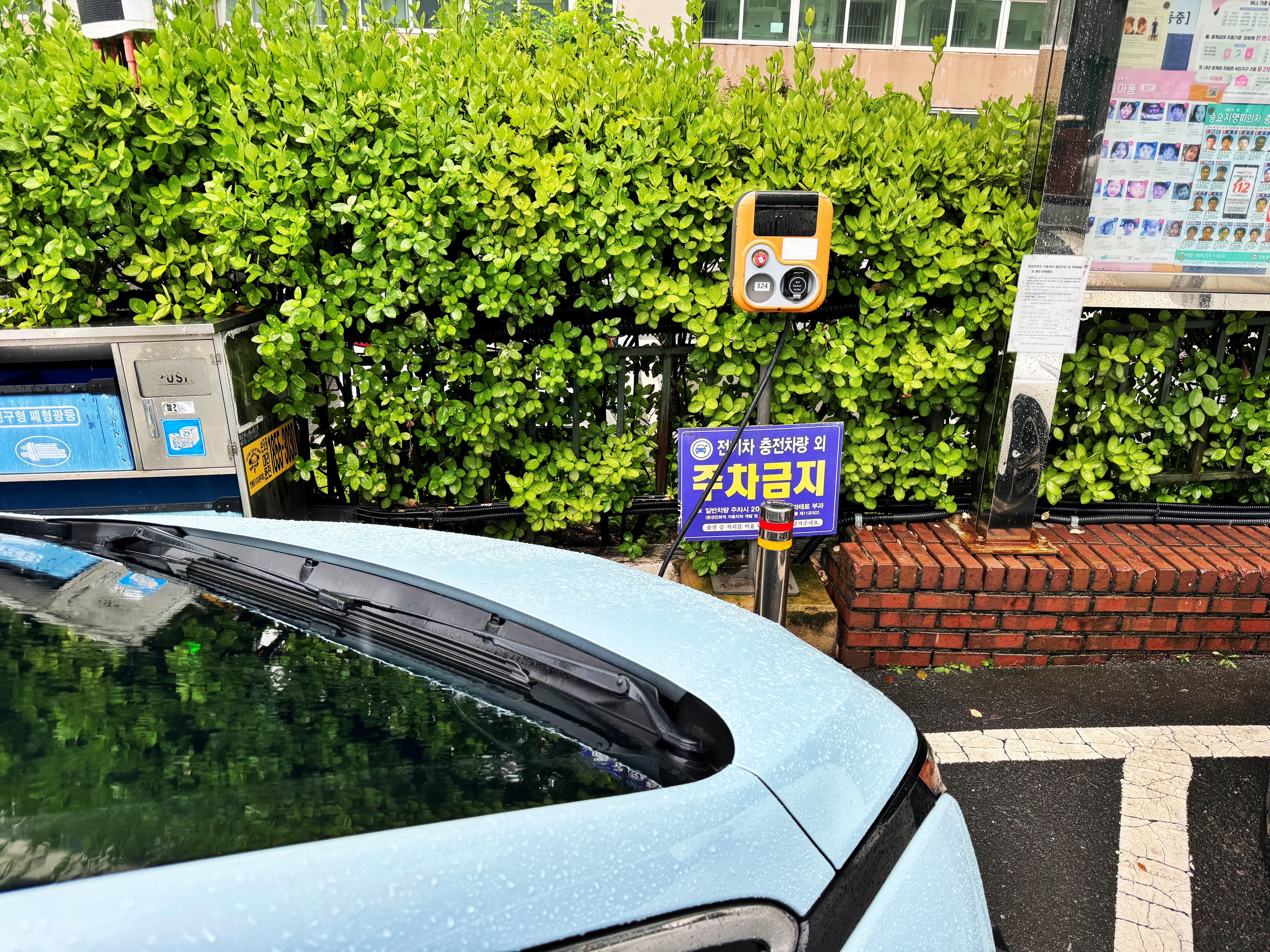 시험 장소는 대전 둔산의 문정중학교. 주차 불가라고 해서 주변 주차장이 어디에 있는지 찾아보고, 학교 바로 아래의 둔산3동 주민센터 전기차충전소에 차를 세우기로 결정하고 시험장 입장시간보다 약 한 시간 먼저 도착했습니다. 버스정류장도 좀 걸어가야 있고 주변 주차장도 동사무소가 아니면 한참 나가야 하더군요. 그렇다고 남의 아파트에 세우기도 뭐 하고요.