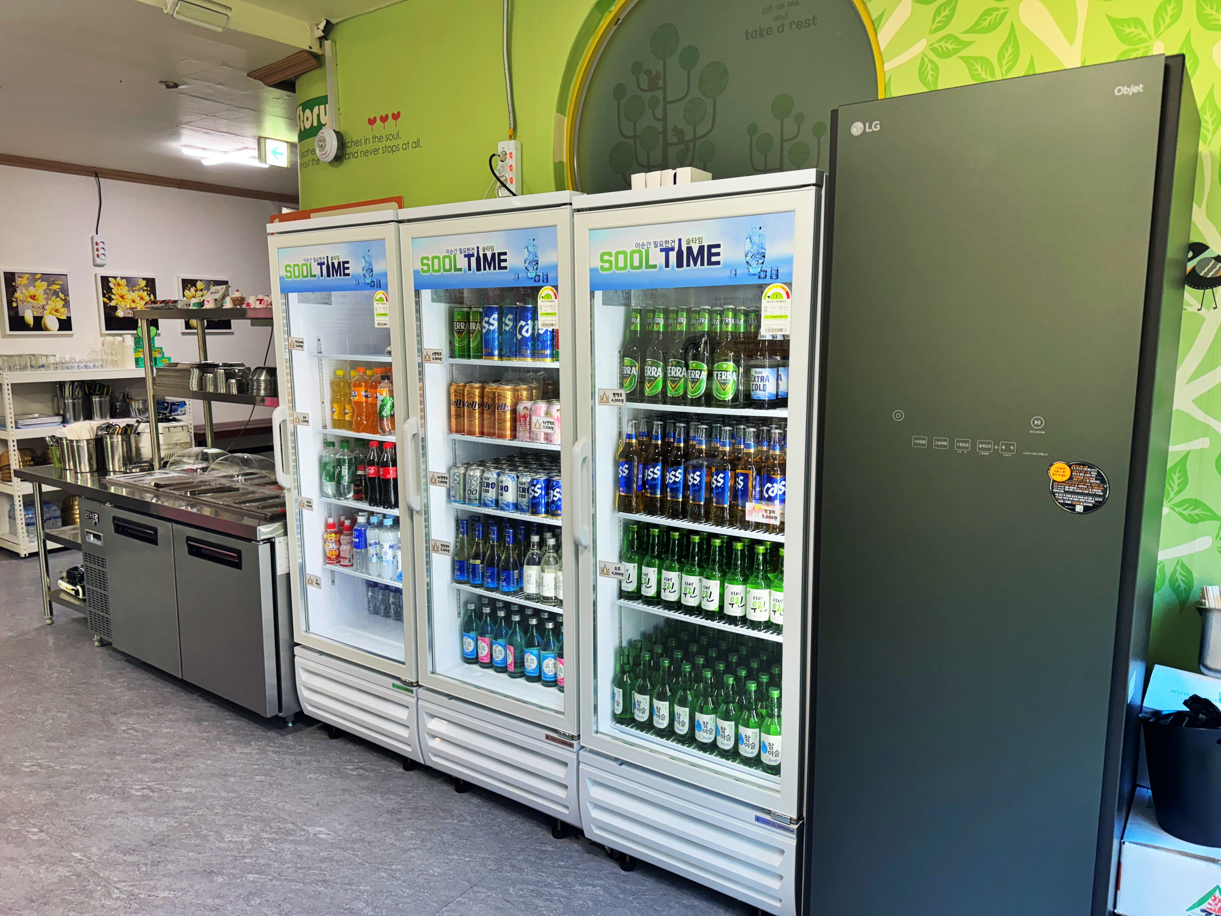 어린이집이었던 흔적은 뒤편 유리창 시트지에도 남아있네요. 주류 냉장고 옆에 셀프바에서 반찬이나 쌈채소를 식판에 담아 가져가면 된다고 합니다.