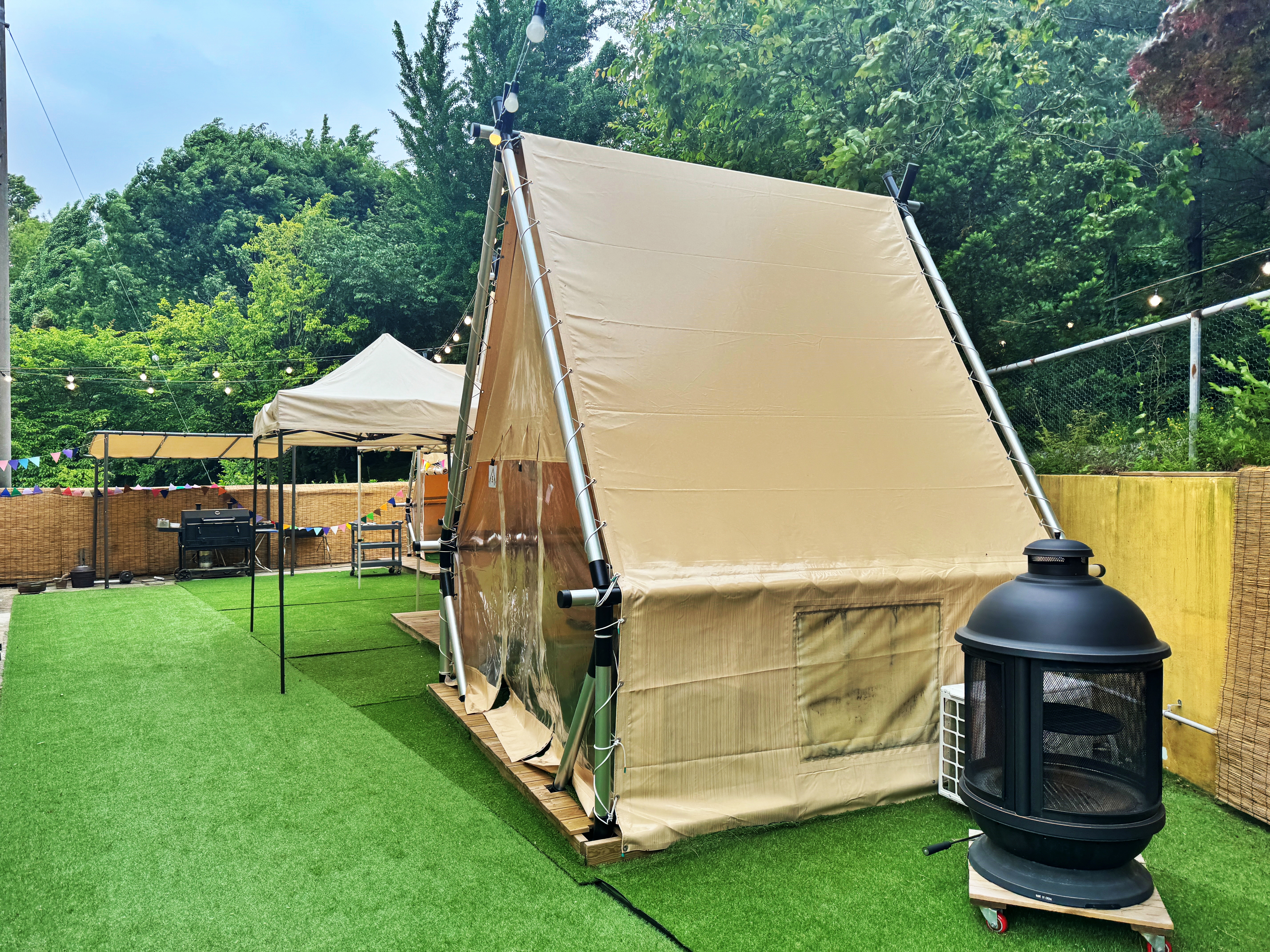 인조잔디가 깔린 건물 측후면으로 글램핑 텐트가 설치되어 있었습니다.