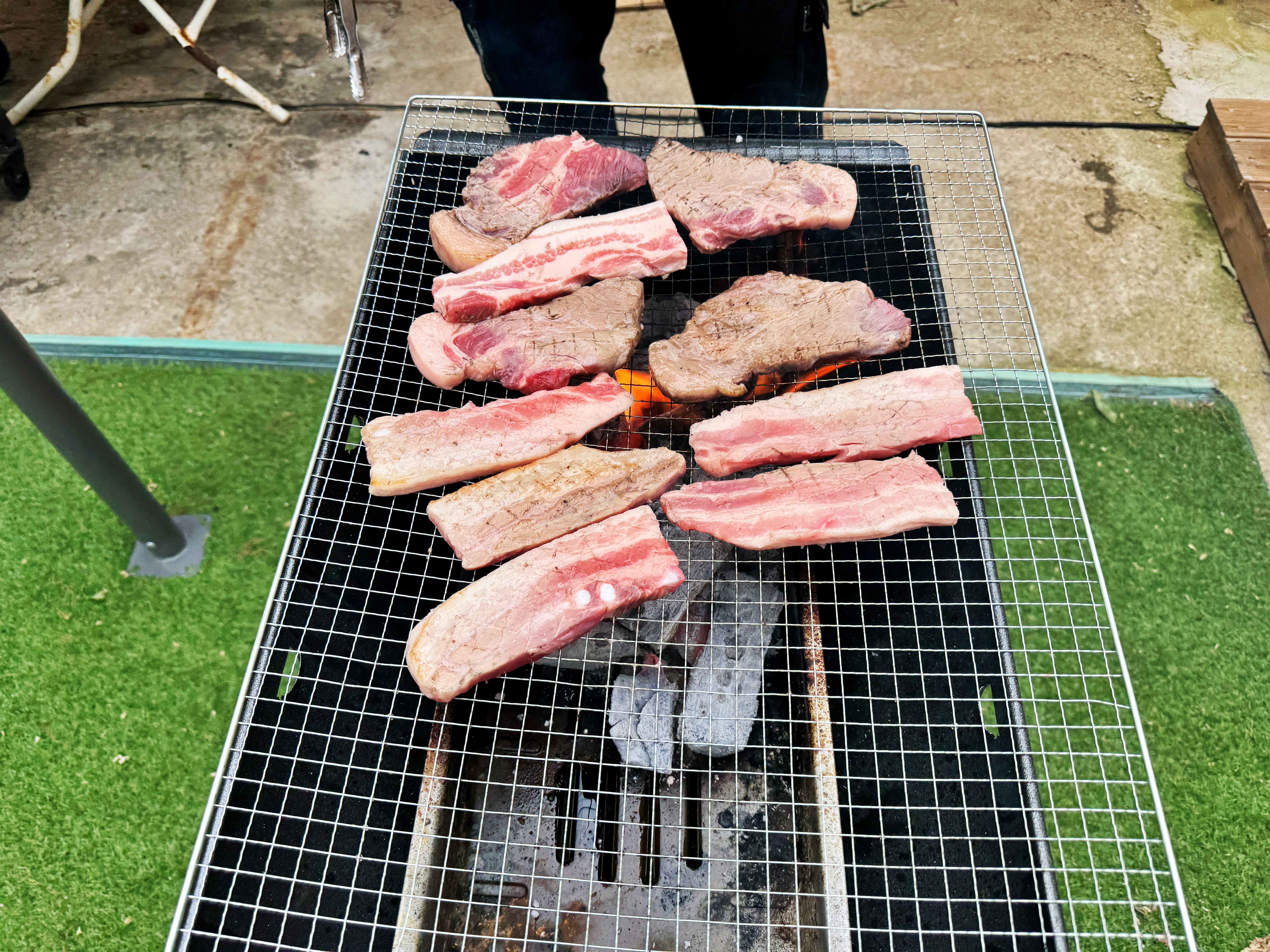 물론 이 텐트 안에서 고기를 구워도 캠핑장에 온 기분은 충분히 낼 수 있습니다만, 5000원을 주고 숯을 구매하면 숯불에 구울 수 있도록 화로대도 빌려준다고 합니다. 그래서 처음엔 숯불에 고기를 구워 텐트 내부 불판에서 한번 더 구워서 먹었고 이후에는 계속 불판에서 고기를 구웠습니다.