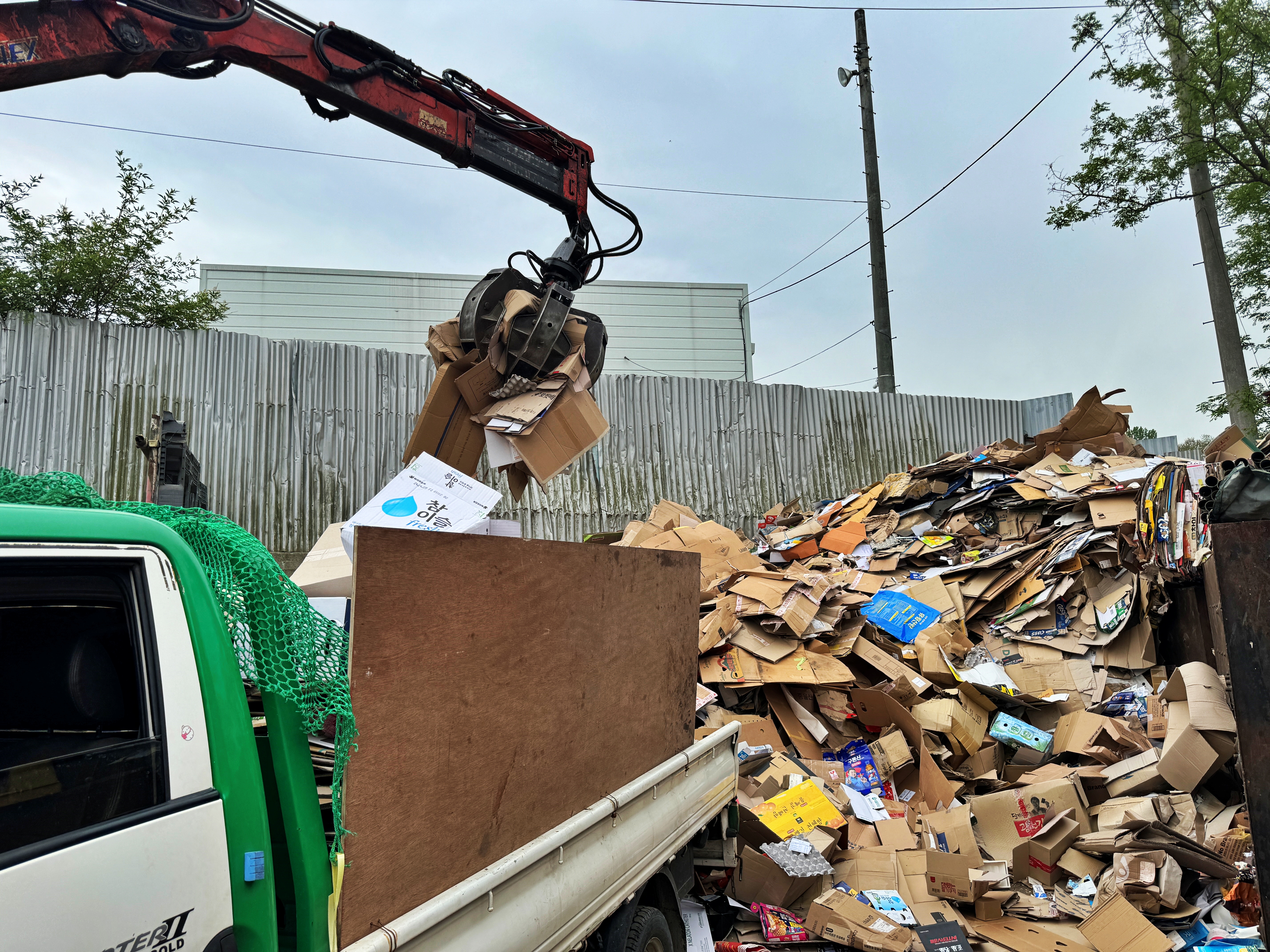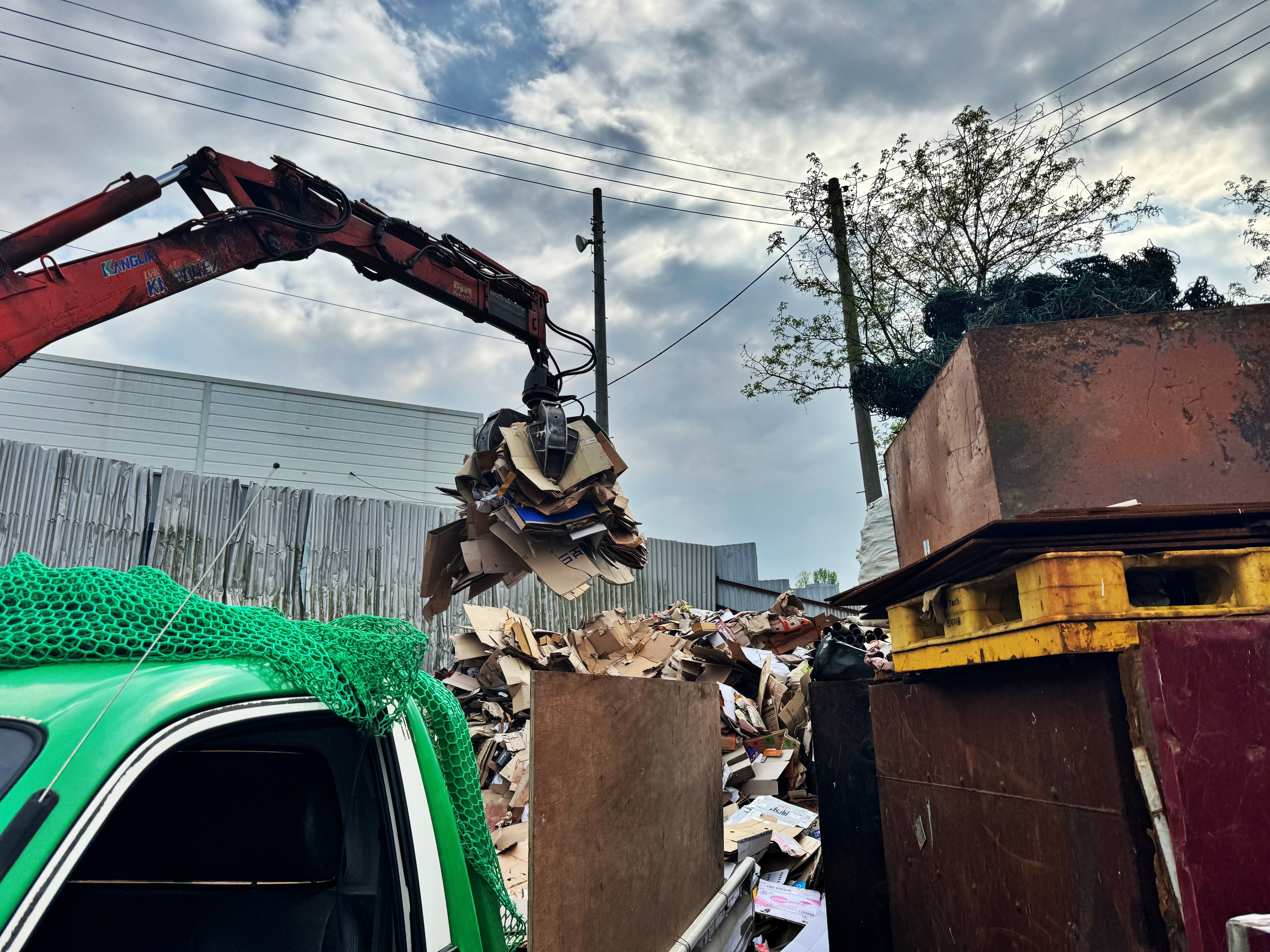 압축장으로 가는 방통집게차가 와서 폐지를 수거하고 있는데 포터에서 바로 폐지를 집어서 8.5톤 프리마 방통에 쑤셔넣습니다.