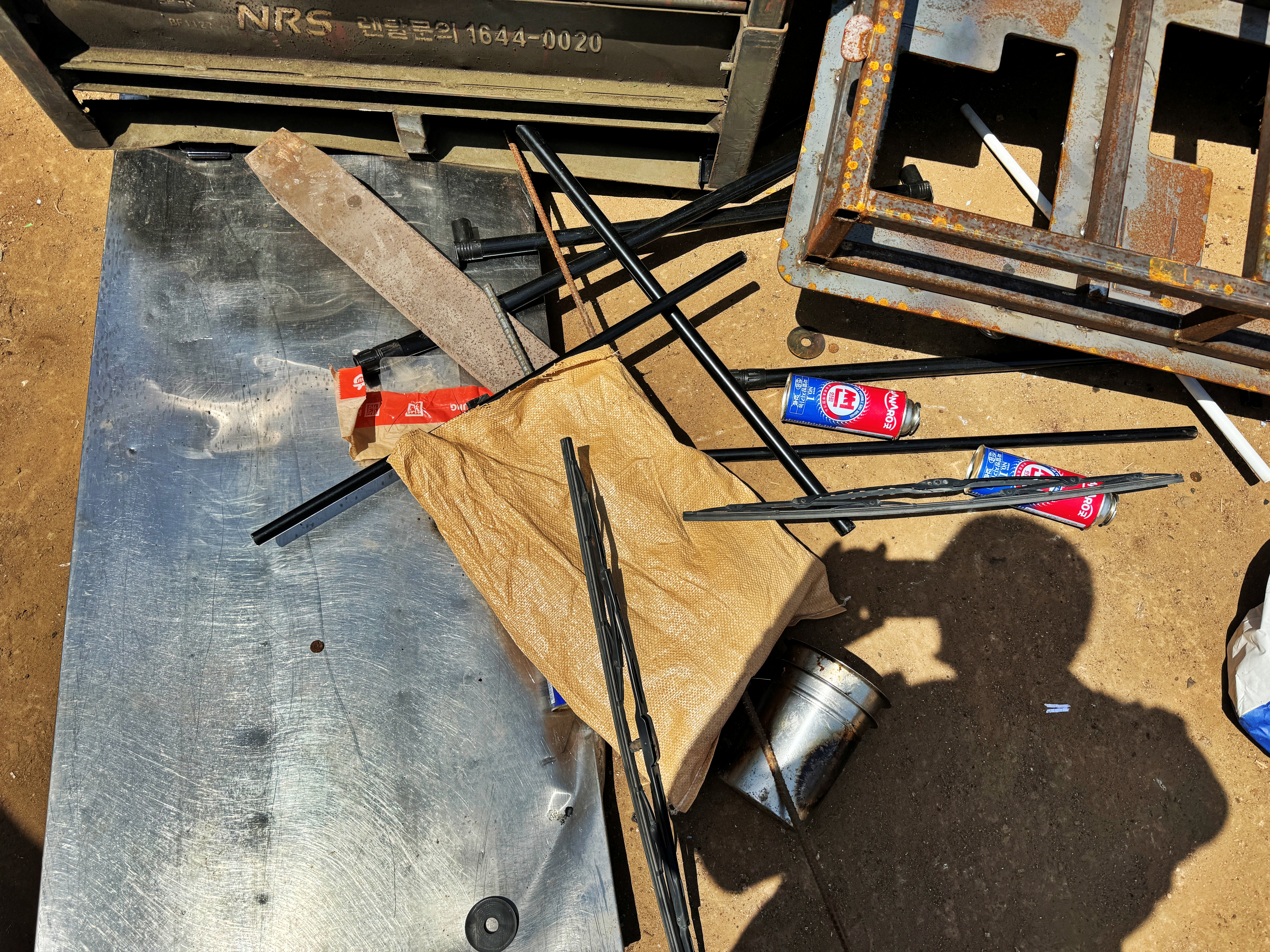 저 뒤에 철판은 제가 가져온게 아니고요... 저거 말고 깨진 판스프링이 들은 마대와 와이퍼 그리고 옷걸이에서 나온 검정색 파이프가 전부입니다.