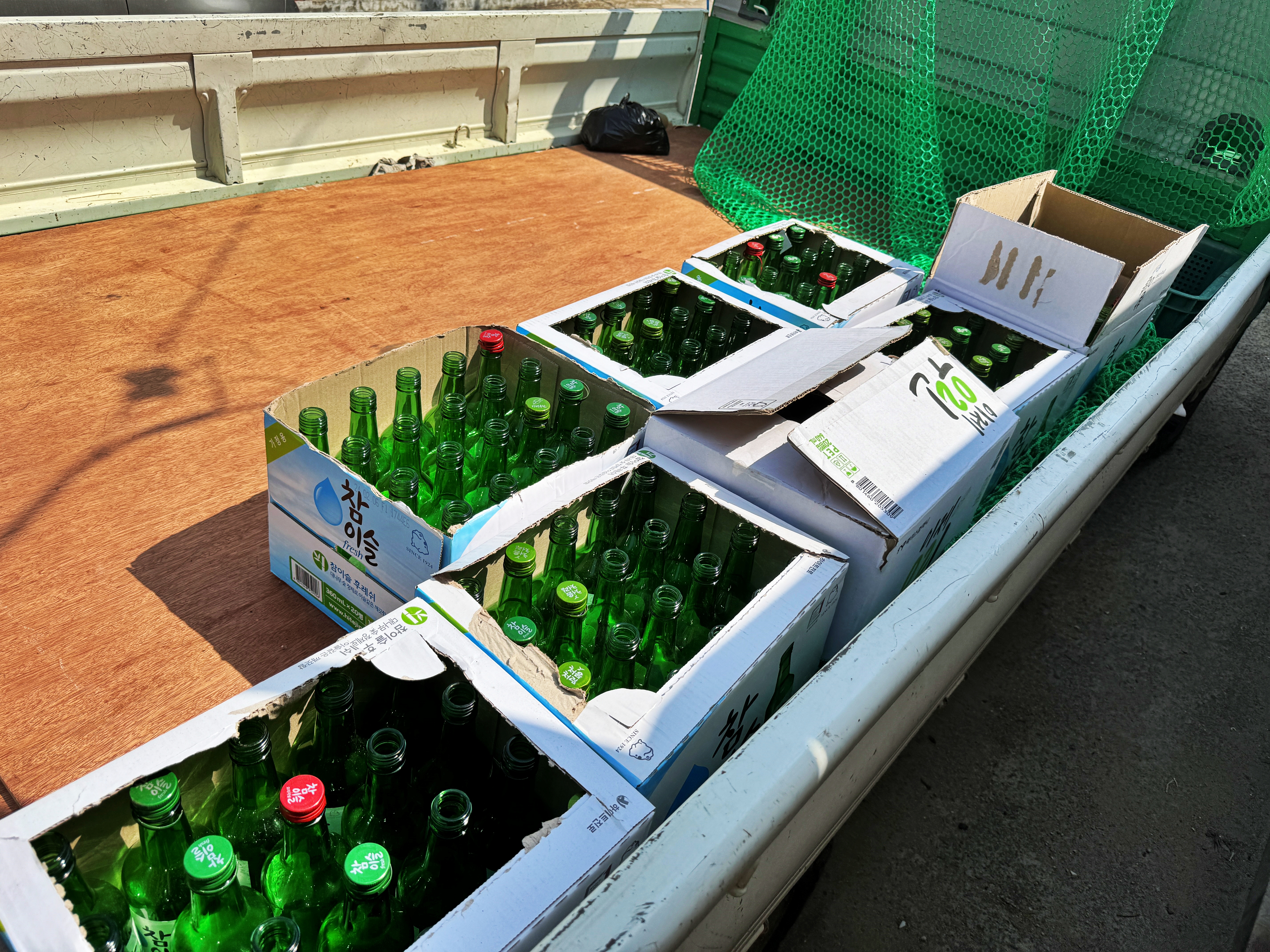 방통차들이 도로 위에 떨어뜨리고 가는 빔이나 판스프링으로 종종 이렇게 꿀을 빱니다. 그렇게 퇴비를 옮기고 소주병도 일부 방출하기로 합니다.