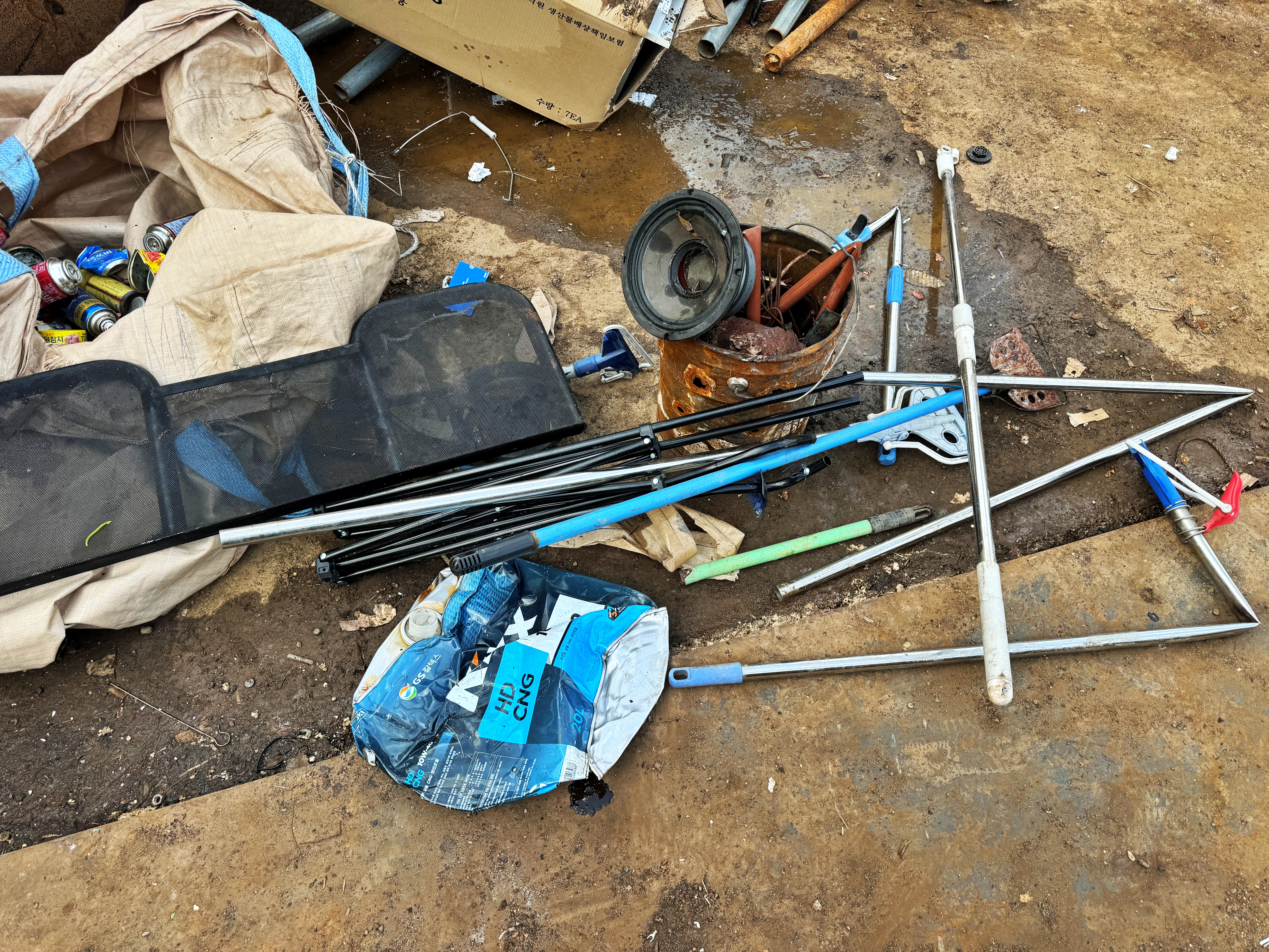 아직 사무실에 다쳤던 날 가져왔던 고철이 잔뜩 있습니다. 이후 통증이 줄어들고 일상생활에 지장이 없는 수준까지 회복하며 종이를 조금씩 줍고 다녔습니다. 그러면서 사무실 주변에 던져놨던 고물들도 다른 분들의 도움을 받아 차에 싣고 고물상에 가게 되었습니다.