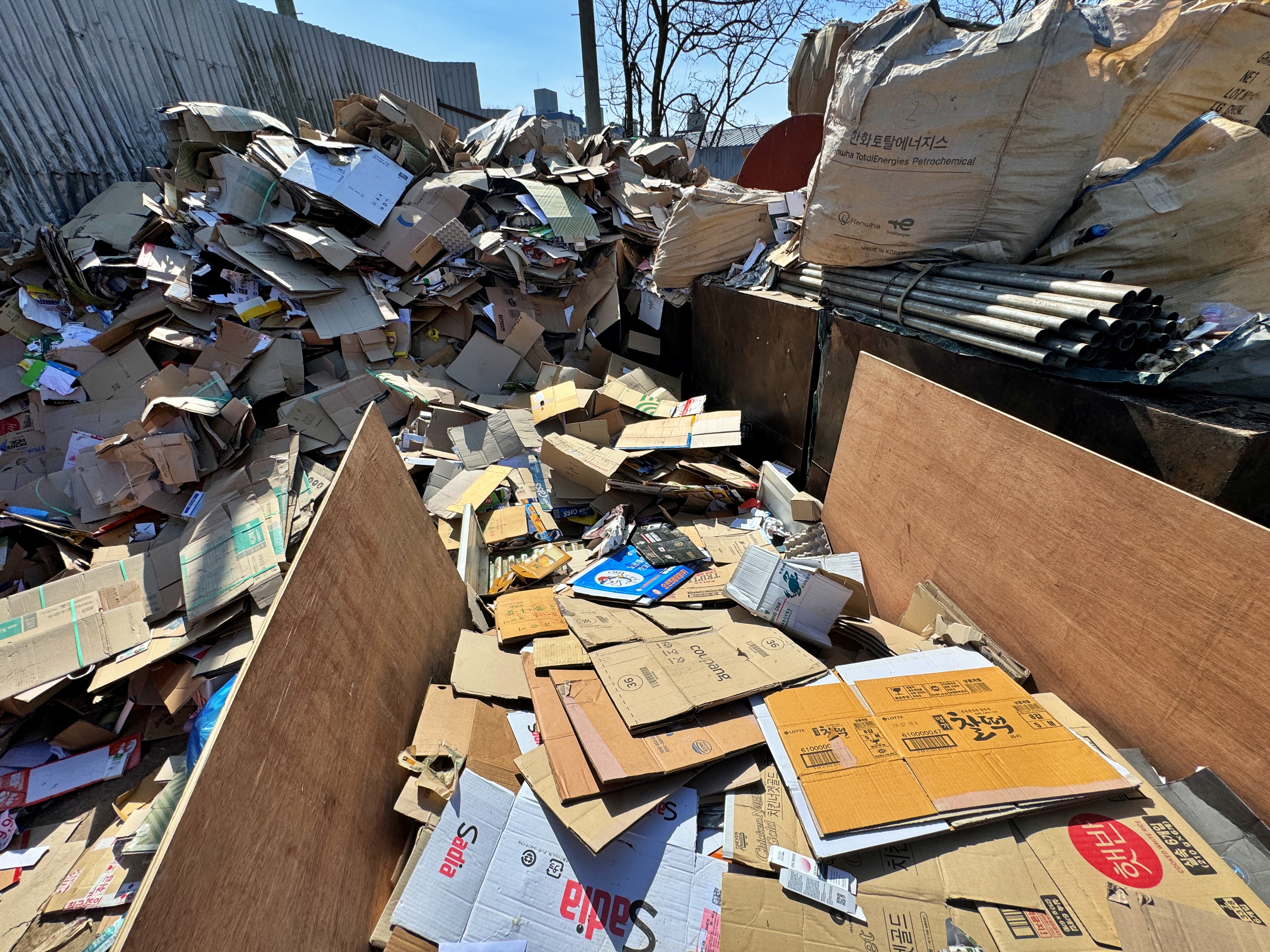 종이의 양은 보시다시피 그리 많지 않습니다.상부는 접지 않은 박스들이고요. 사실상 고철과 스테인리스 냄비가 핵심이었습니다.