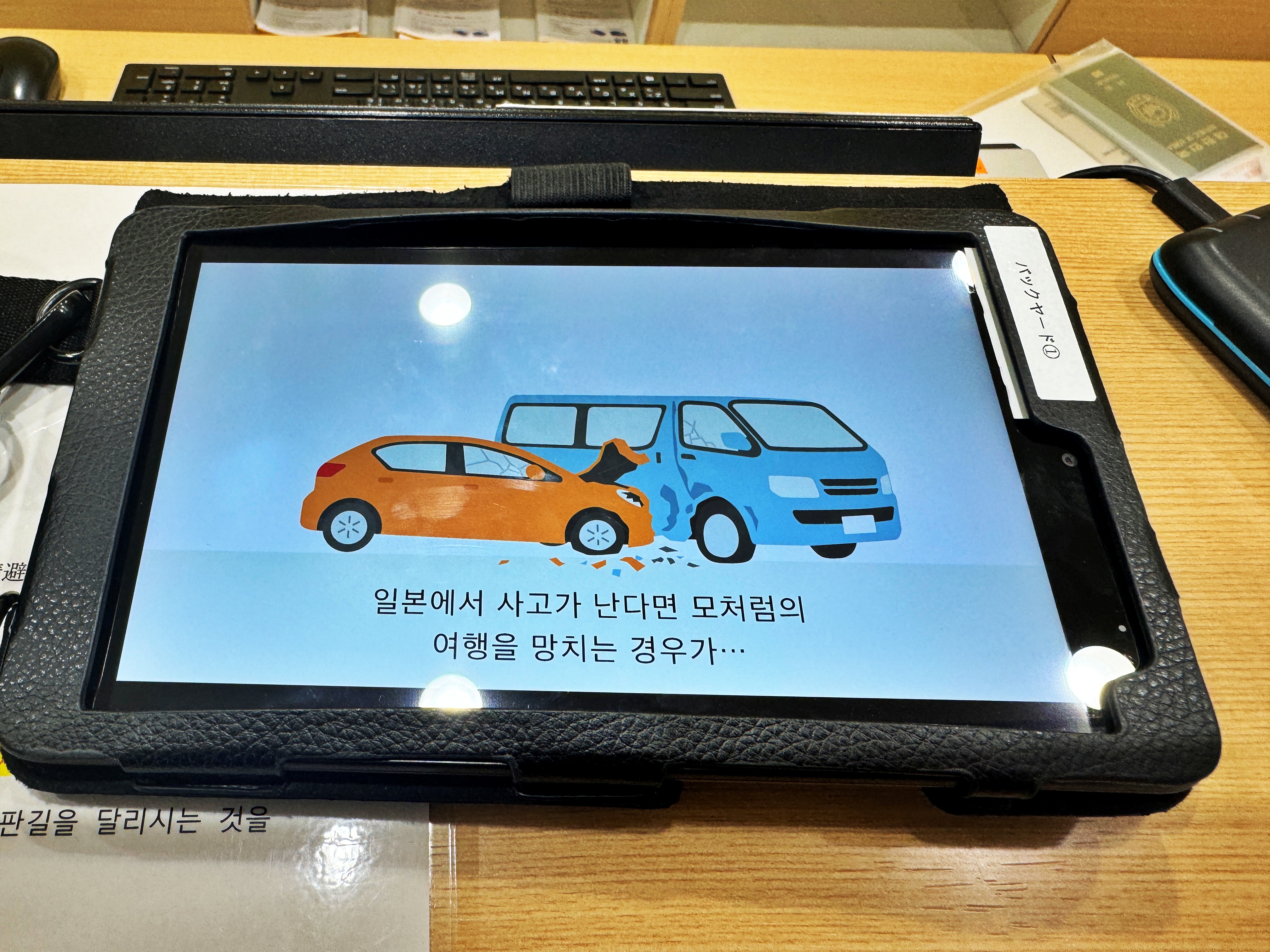 잠시 기다리니 출차업무를 마치고 온 여직원이 저를 응대해줍니다. 공항 출장소에서 받아온 서류를 주니 태블릿을 하나 보여주네요. 일본에서 운전시 주의점과 사고시 대처방법에 대해 만들어둔 4분짜리 영상입니다.