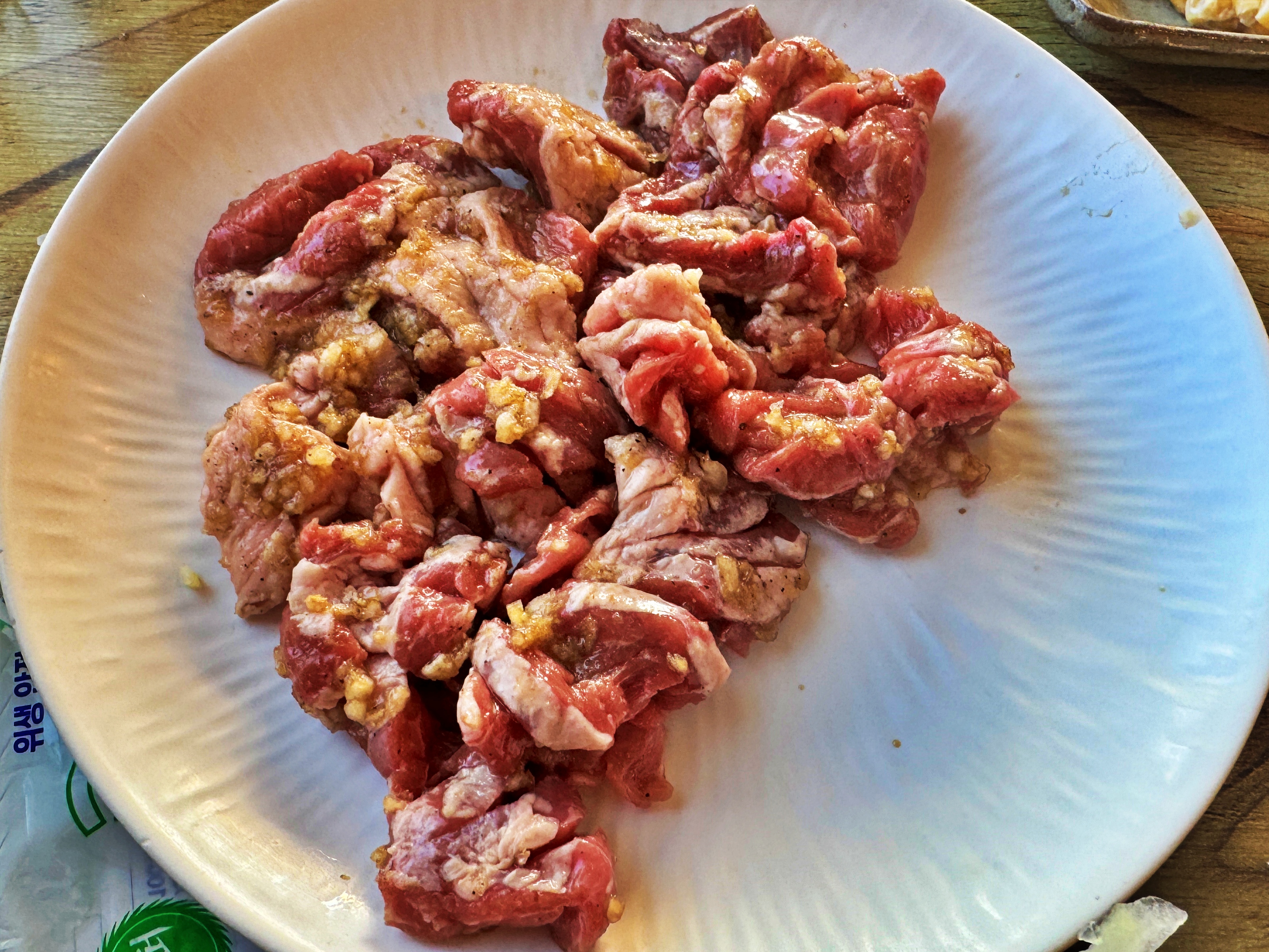 솔직히 배는 불렀는데 맛이나 보고 가자는 생각에서 주문했습니다. 그냥 주물럭같은 느낌이고 갈은 마늘이 양념에 들어가네요. 구워지면 양념 맛이 어떤지 느끼기는 어려웠습니다.