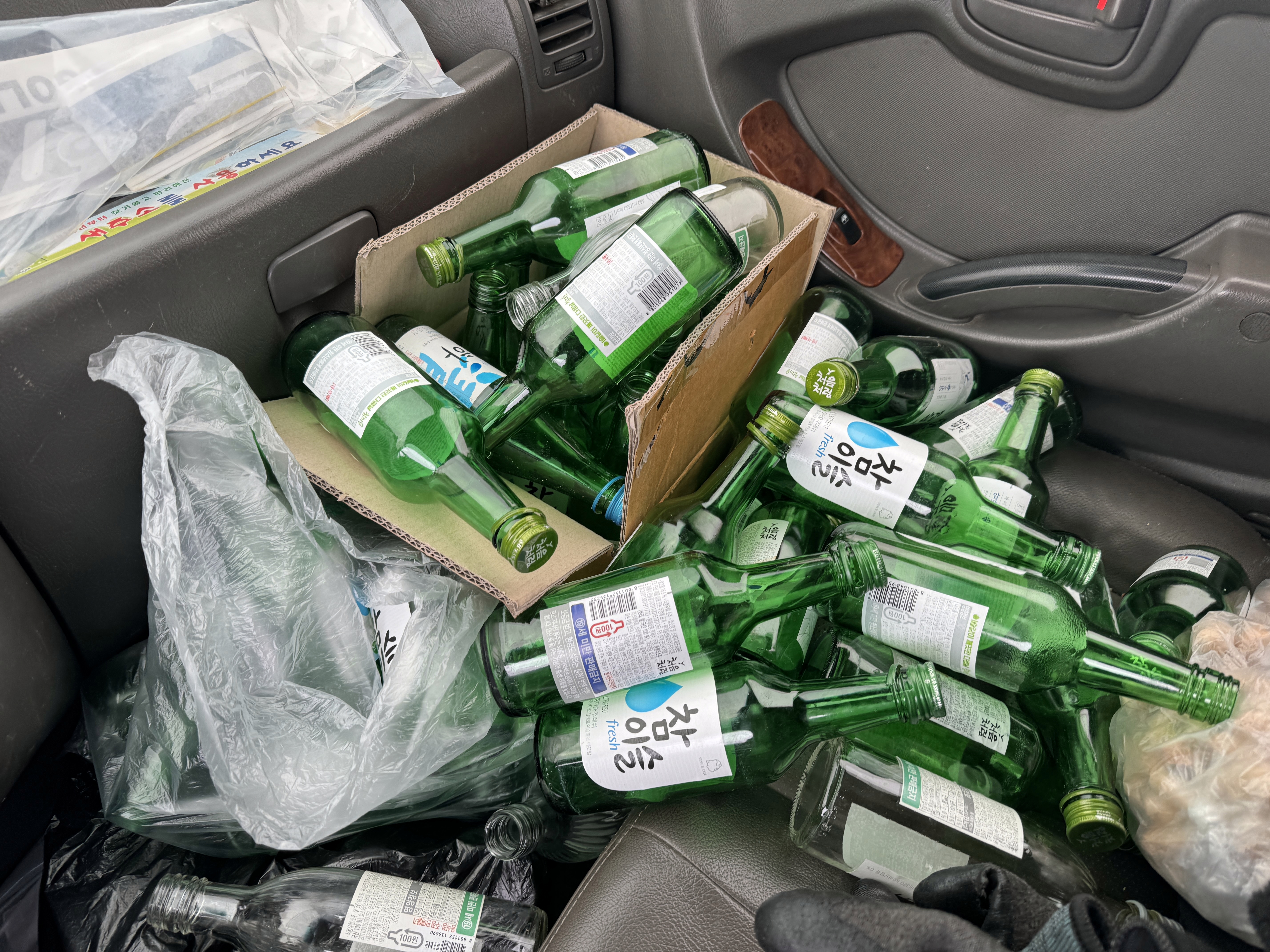 요즘 트랜드는 공병이랑 알루미늄 캔이라고 하네요. 소주병은 100원 맥주병은 130원입니다. 고물상에 가면 제 값을 주지 않지만 마트에 가면 보증금 제값에 매입합니다. 합덕에 쌓아두고 박스에 온전히 모인 물건을 적당히 가져다 팔며 물건으로 바꿔오고 있습니다. 한 번 돌면 포터 조수석에 이렇게 쌓여버립니다.