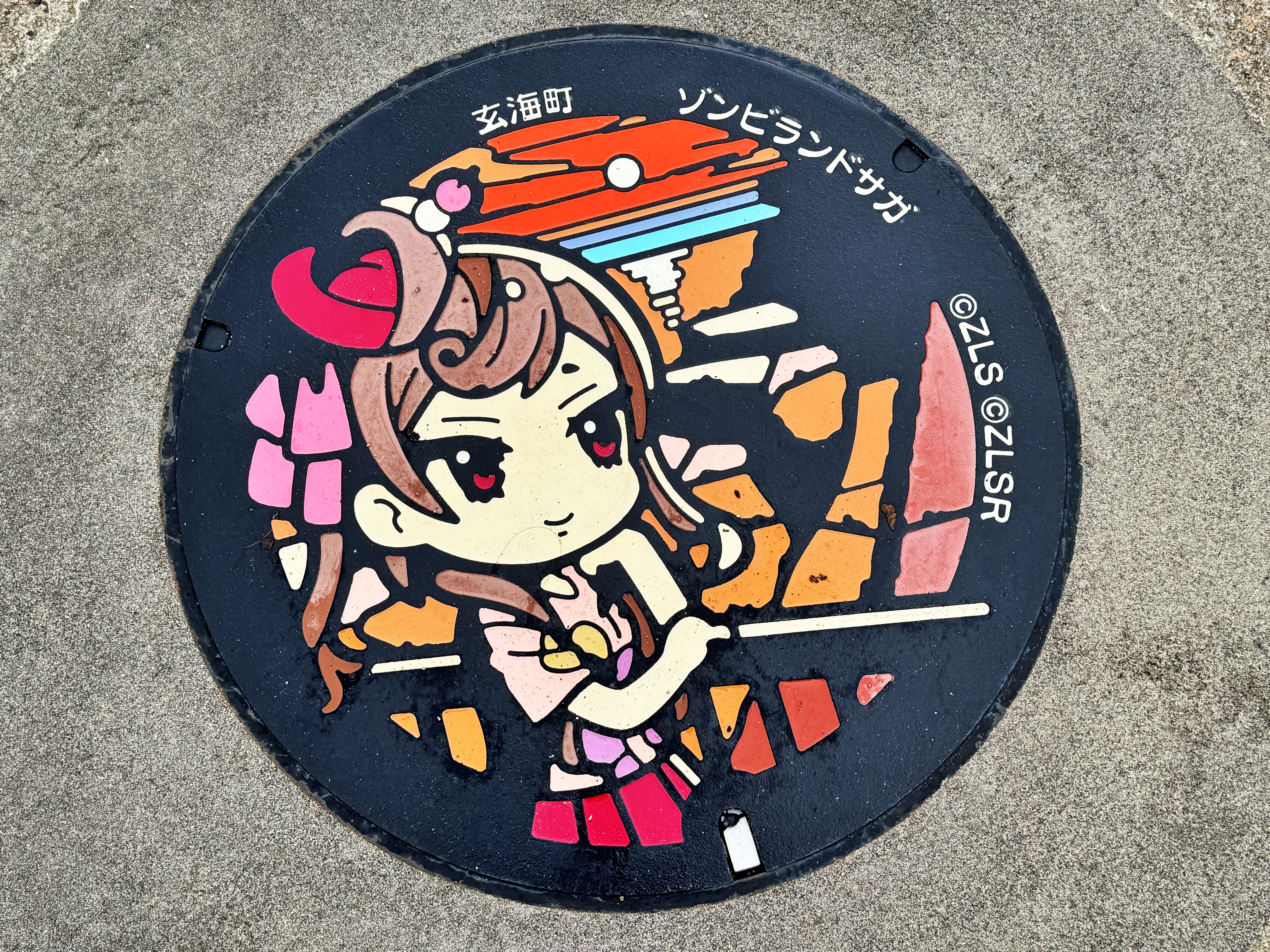 30개의 맨홀 중 식당 안에 있는 유일한 맨홀입니다. 역시 이 프로젝트를 위해 설치된 맨홀로 용도는 없습니다. 배경은 이 가게의 마스코트와 1기 5화에서 광고를 촬영했던 유메미사키공원의 언덕이네요. 이 식당을 정말 그리워했던 사키의 선망하는 모습이 그려져 있습니다. 생전 폭주족이었고, 좀비가 된 이후로도 아이돌 활동에 반감이 컸던 상당히 거친 캐릭터임에도 최애 식당 앞에선 여느 소녀와 다를 바 없는 모습을 보이고 있습니다.