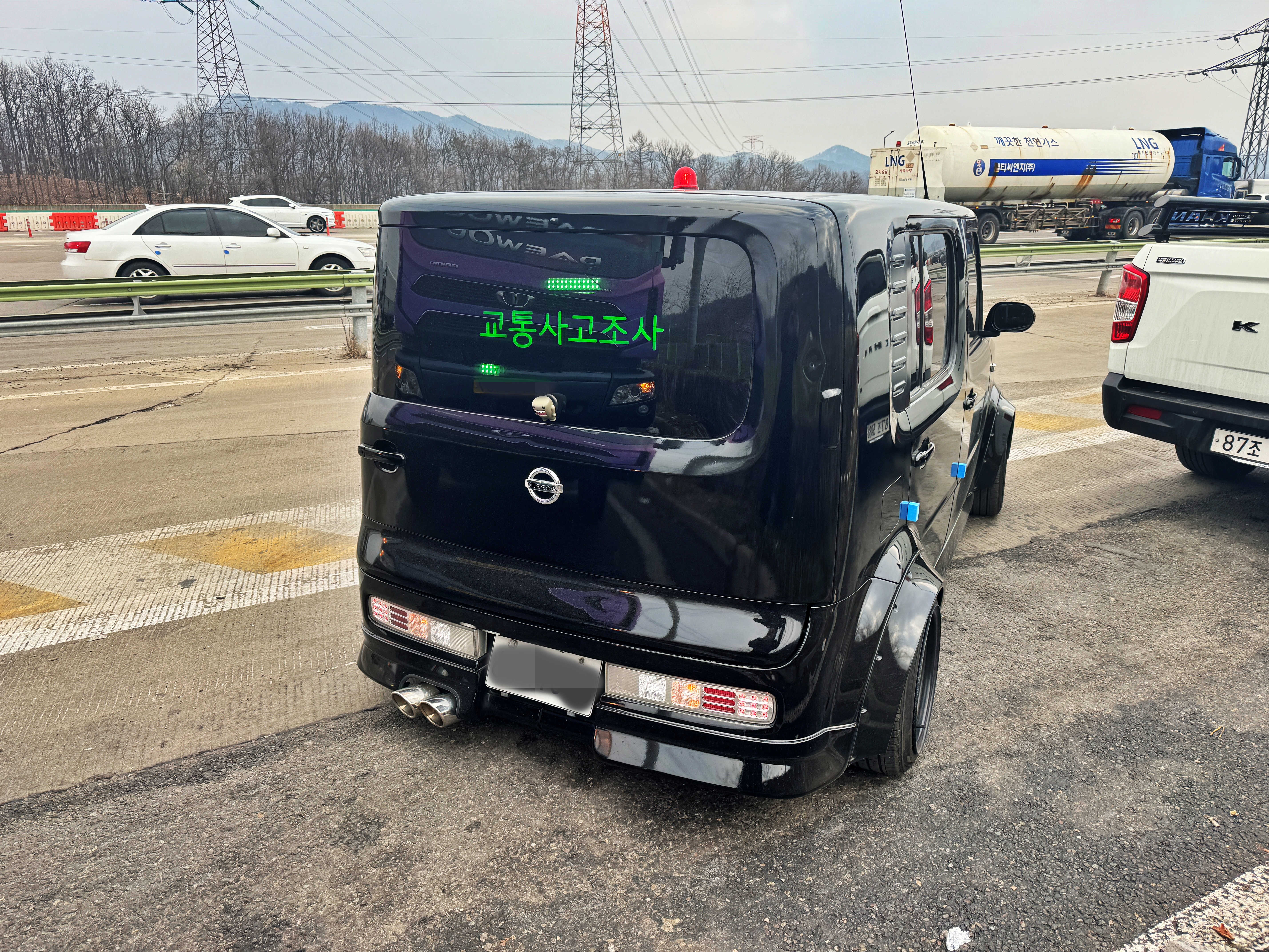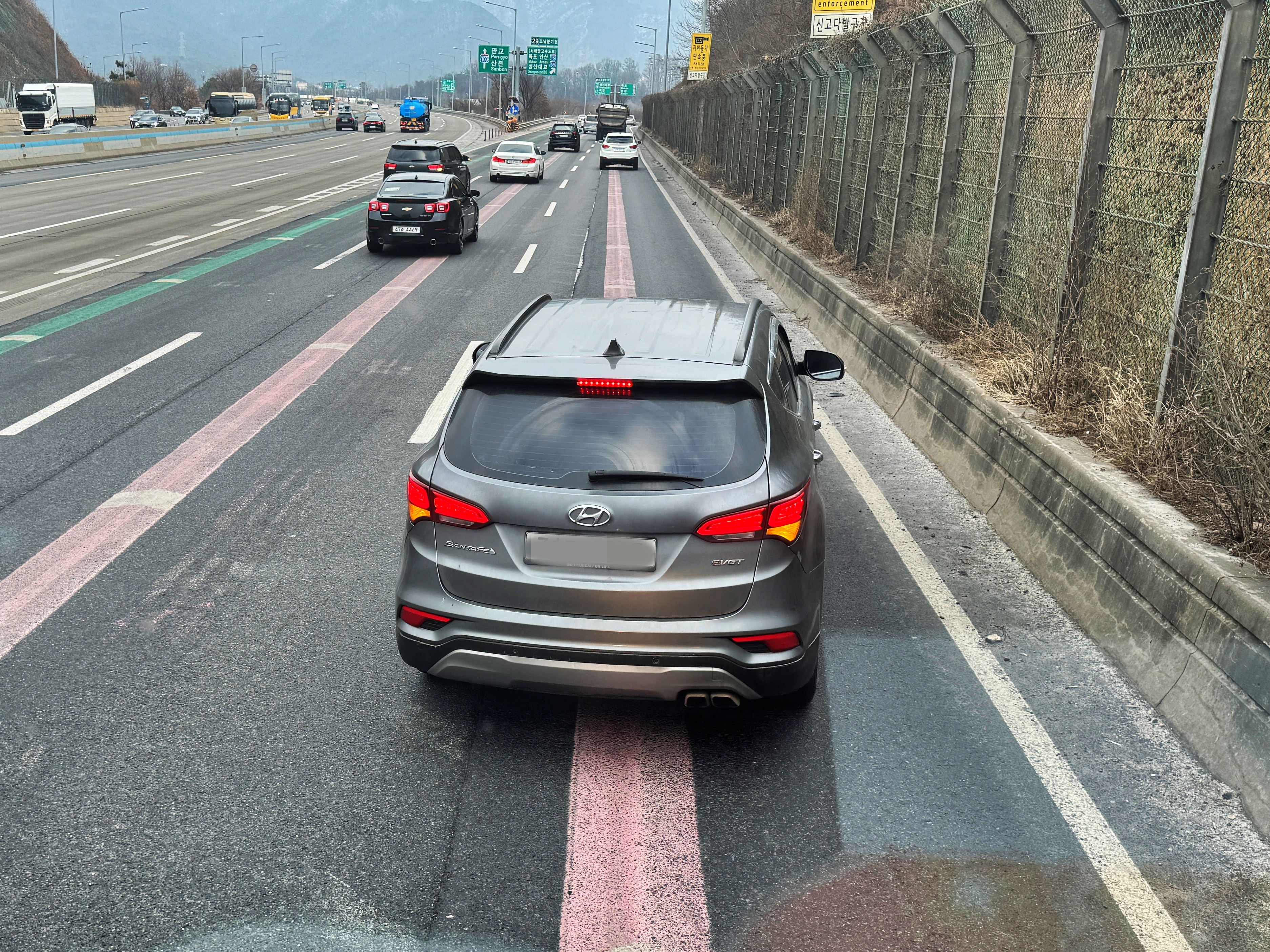 열심히 비집고 들어오셔서도 깜빡이를 끄지 않고 계속 진행하기에 저는 옆에 새로 생긴 차선으로 진입했고 진입하고 좀 가다가 싼타페가 옆도 보지 않고 그냥 2축과 3축 사이 에어탱크가 있는 난간대와 3,4,5축 타이어를 비비고 와서 섰습니다.